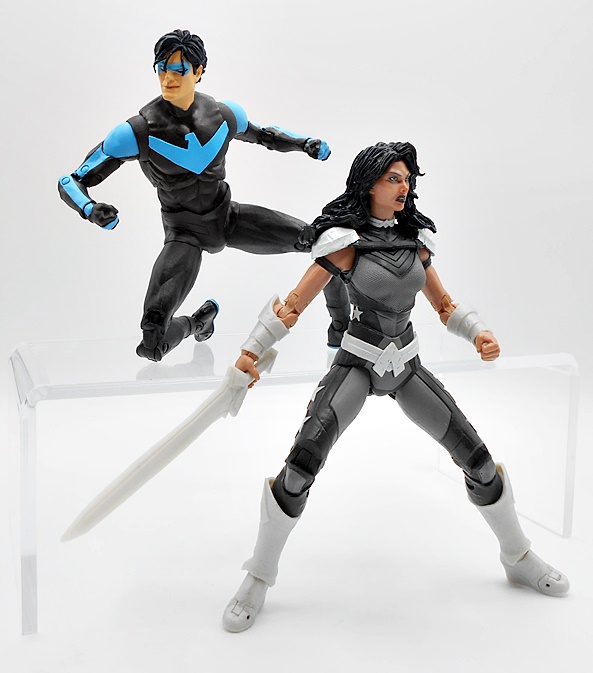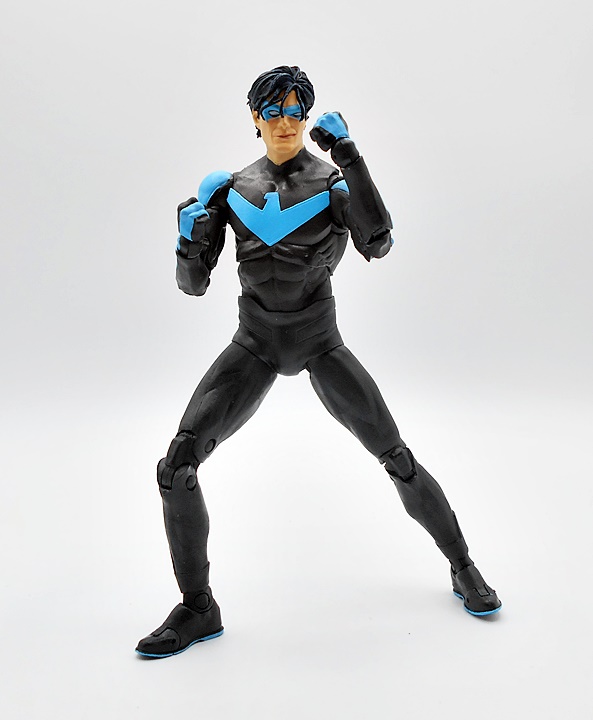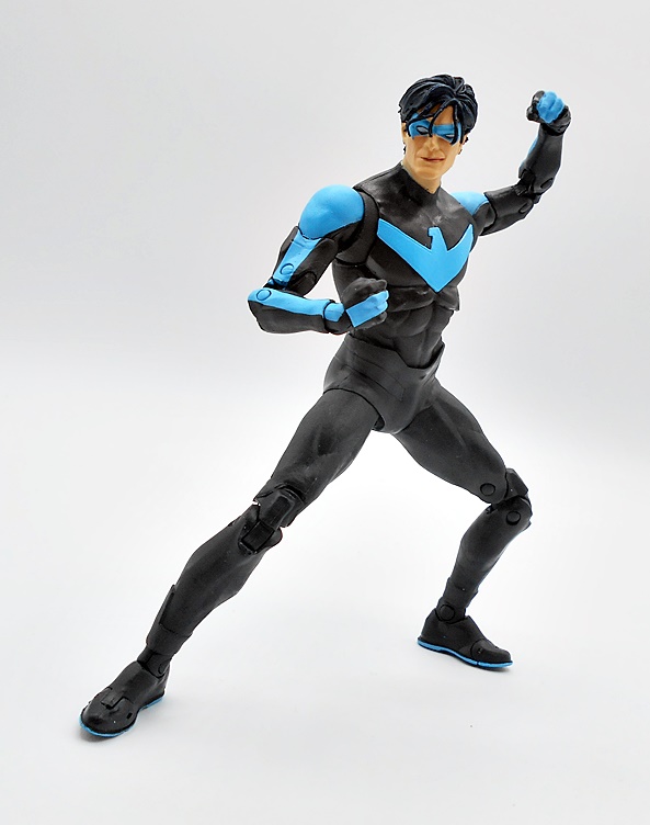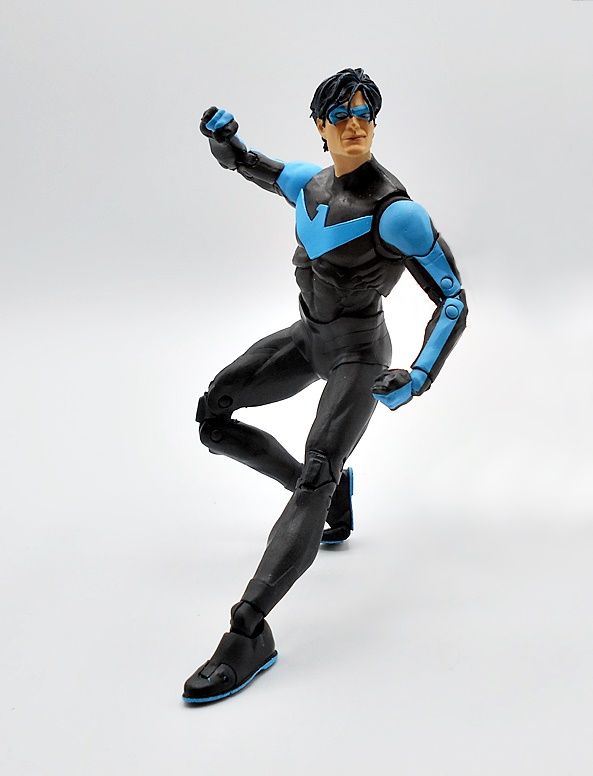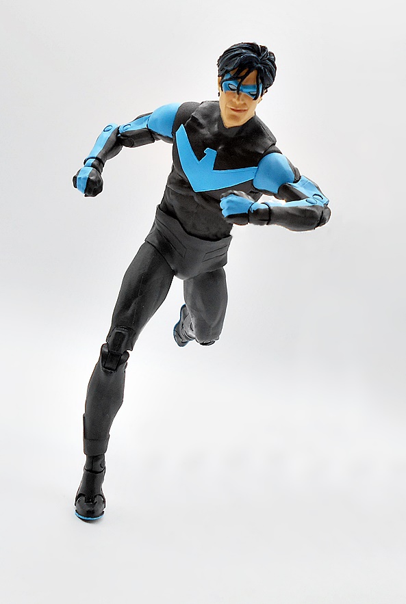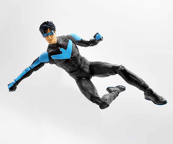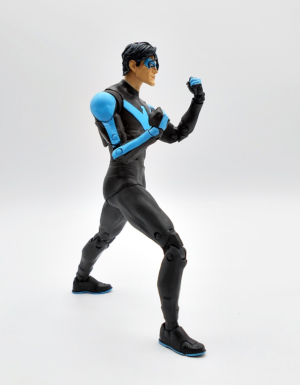 Naturally, you want your Nightwing to be acrobatic and agile, and this body takes care of business. You get standard DC Multiverse articulation here, and aw hell, let’s just run through it. The arms have rotating hinges in the shoulders, swivels in the biceps, double hinges in the elbows, and rotating hinges in the wrists. The legs have rotating hinges up in the hips, have double hinges in the knees, rotating hinges in the ankles, and hinges in the toes. There’s a ball joint under the chest and another in the neck. As usual, the only thing missing here are swivels in the thighs. Nonetheless, the lithe body works great with the articulation style and Nightwing is just tons of fun to play with.