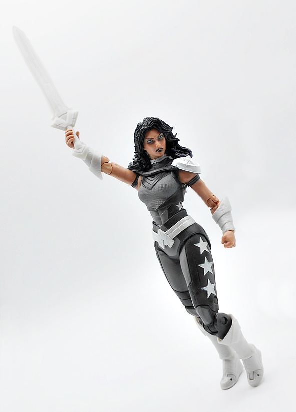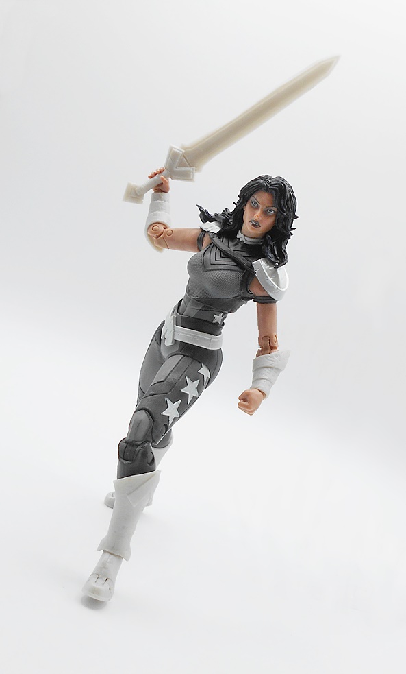 Donna come with one accessory and that’s a pretty impressive sword. It’s cast in the same pearlescent plastic as her boots and such and the wedge shape of the cross guard matches the Amazonian buckle on her belt. Her right hand is sculpted to wield the sword while her left hand is balled into a fist to make with the punching!