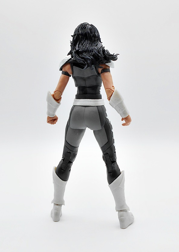 Unlike Nightwing, I do have a few Donna Troy/Wonder Girl figures in my collection, but it’s been a long while, so I’m happy to grab a new one, but my how she’s changed! Well, let’s start with the outfit, because it is excellent. Sure, it’s very monochrome and I prefer either a little more color, or her trippy starfield suit, but clearly the context we’re going for is grimdark and I still can’t help but love all the detail and work McFarlane put into this costume. The suit itself is a black and gray combo with the gray bits being very nicely textured and the darker areas having some clean panel lines. The boots, bracers, belt, and shoulders are all cast in a somewhat pearlescent plastic, which looks a lot less flat than I expected. You also get some similarly colored stars on the outsides of her thighs, adding a little pop and cheer. If I wasn’t a huge fan of this costume at first, the sculpt sold it to me after just a short while.