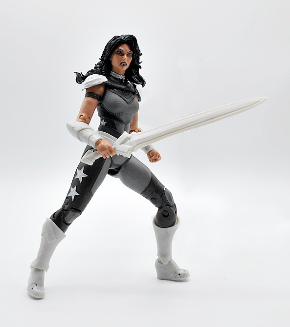 Donna come with one accessory and that’s a pretty impressive sword. It’s cast in the same pearlescent plastic as her boots and such and the wedge shape of the cross guard matches the Amazonian buckle on her belt. Her right hand is sculpted to wield the sword while her left hand is balled into a fist to make with the punching!