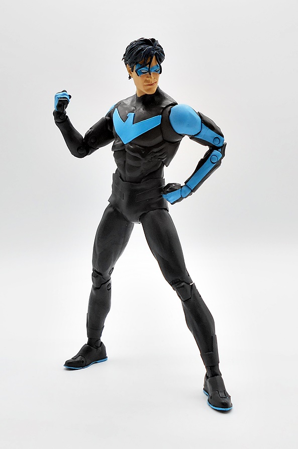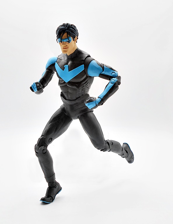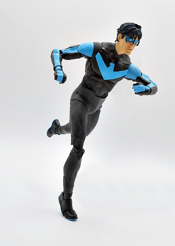 Naturally, you want your Nightwing to be acrobatic and agile, and this body takes care of business. You get standard DC Multiverse articulation here, and aw hell, let’s just run through it. The arms have rotating hinges in the shoulders, swivels in the biceps, double hinges in the elbows, and rotating hinges in the wrists. The legs have rotating hinges up in the hips, have double hinges in the knees, rotating hinges in the ankles, and hinges in the toes. There’s a ball joint under the chest and another in the neck. As usual, the only thing missing here are swivels in the thighs. Nonetheless, the lithe body works great with the articulation style and Nightwing is just tons of fun to play with.