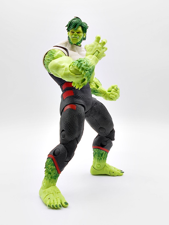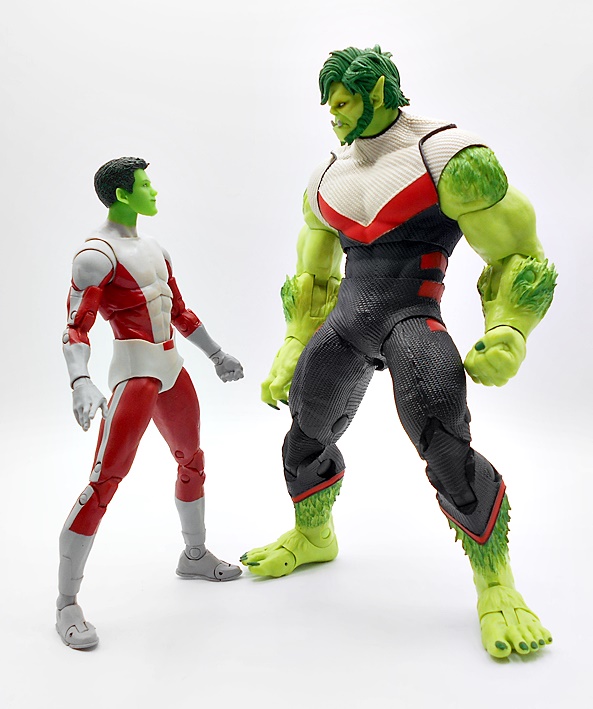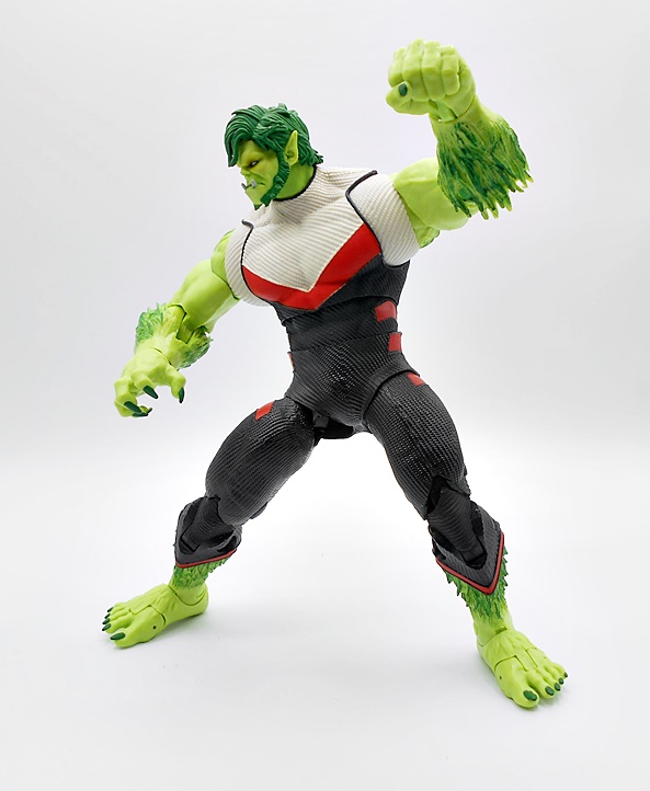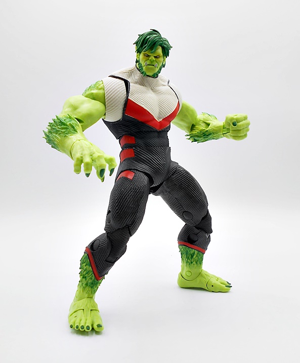 Yup, he’s a big boy! Is this what Beast Boy looks like in the current comics or is this just some jacked up half-beast form? I have no idea. I poked around a bit to try to find out, and I could honestly find nothing that looks like this from the comics, but that’s OK. One of my favorite mantras is that I don’t have to be familiar with the source material to enjoy a figure, and boy do I really like this figure! Many have pointed out the similarities the costume shares with Hulk in the temporal suit from Avengers Endgame, and yeah it’s hard not to see that. The suit does have some fantastic texture to the black and cream-colored portions with some smooth red trim to make it pop. But what I really dig is the coloring of the skin, with some vibrant light green on the smooth bits and some darker green on the sculpted fringe. Sure, it looks a bit more like roided out broccoli than it does beast fur, but I still love it.