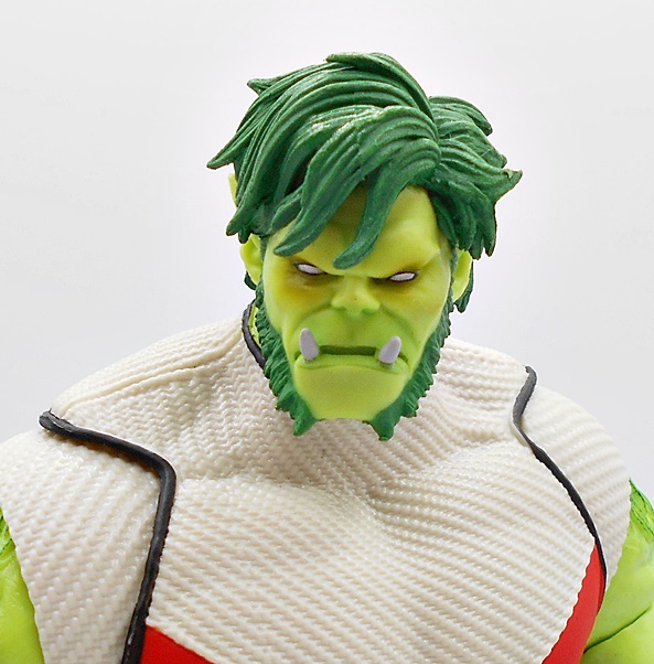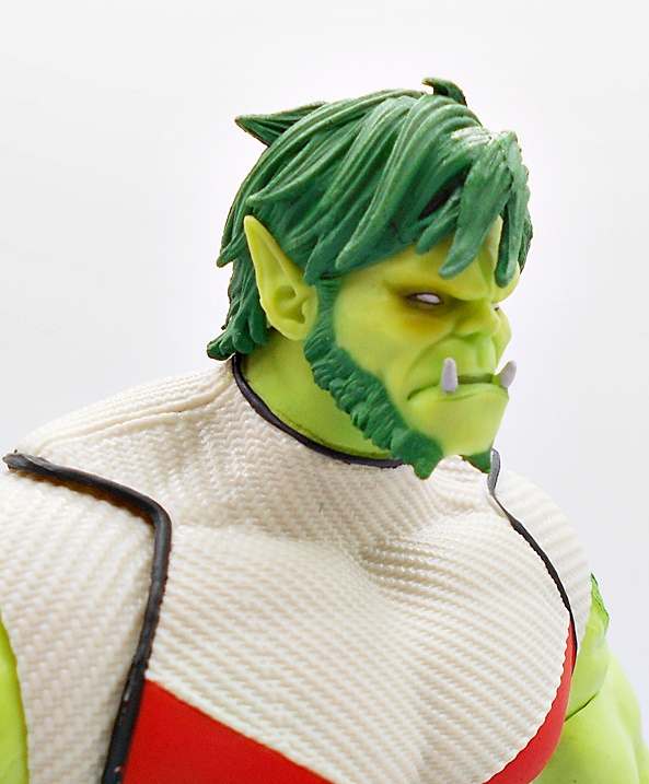 There’s plenty to love in this head sculpt too. Once again you get that beautiful light green on the skin, but here you have some really breathtaking gradients of slightly darker green and a bit of red in the cheeks and dark shading around the pupil-less eyes. The sculpted tuft of dark green hair is very nicely done, as is the hairy fringe that extends from his sideburns to around his jawline. The pointed ears look great and he’s got two tusk-like teeth protruding from the bottom jaw. Everything about this portrait is just superb!