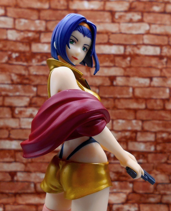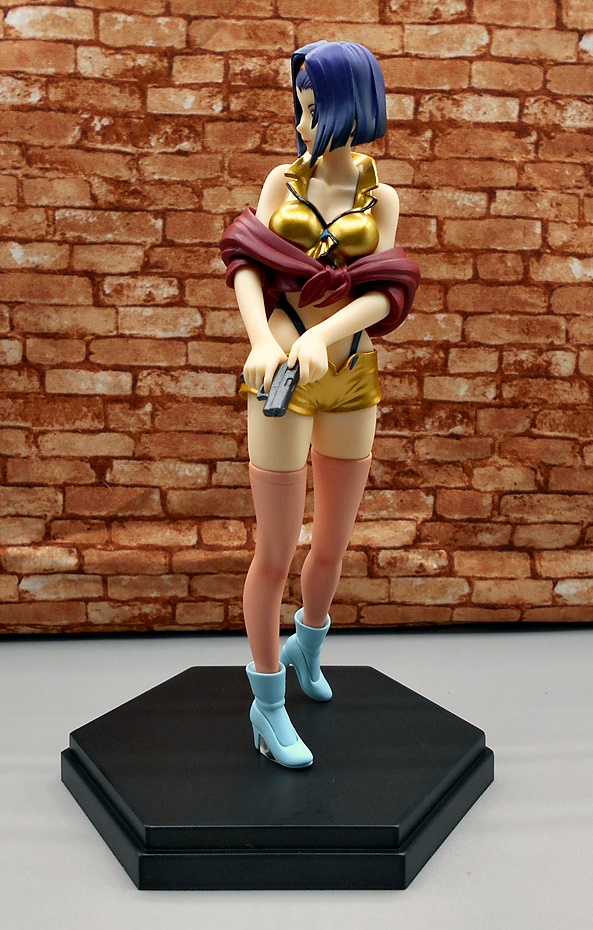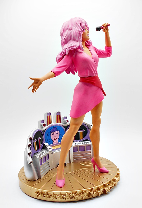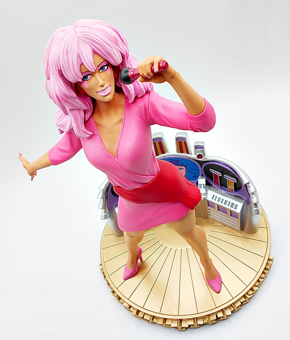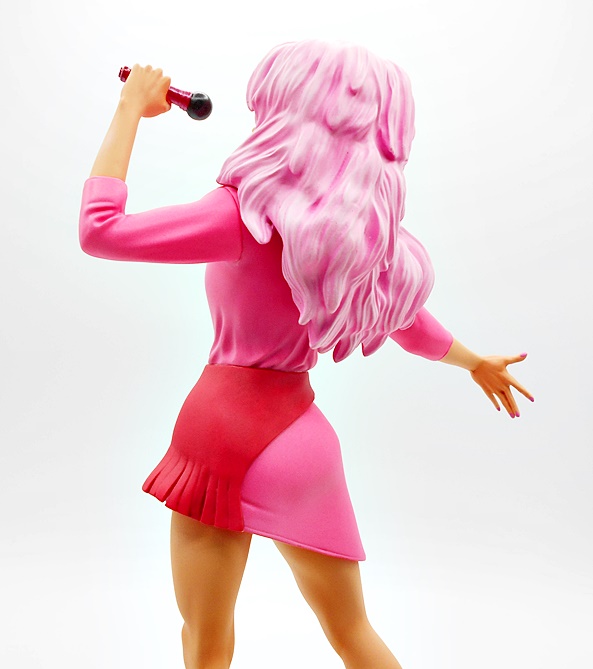 Here she is standing up on the stage, rocking out, and looking well… Outrageous! The figure comes as one piece and all you have to do is peg the rod on her left foot into the base and she’s ready to go. I’m really going to go into full-on gush mode, because I literally love every last thing about this statue and the way she turned out. The pose is absolutely superb and ripped right from the opening of the cartoon. She stands with legs apart (oh god, does she have great legs!), microphone raised, her free hand open behind her and strikes a pose worthy of a magazine cover… or even a statue!