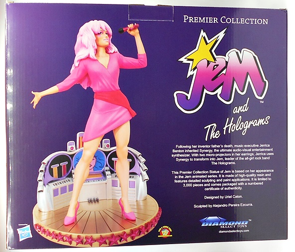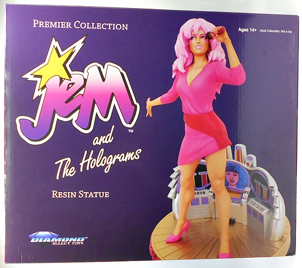 I have pretty nice, and mostly complete examples of Jem, Aja, and Kimber, but no Shayna. I also have a second Jem dressed as Jerrica. On the Misfits side of things, I have Pizzazz, Roxy, and Stormer. I have a complete boxed Star Stage and a complete Rockin Roadster, both of which still play the cassettes!. I’m really happy with this collection, and Shayna is the only doll I still actively search for at a decent price. Anyway, I’m always on the lookout for new Jem merch and needless to say I got all hot and bothered when I saw Diamond was doing Jem in their higher end Premier Collection statue line.