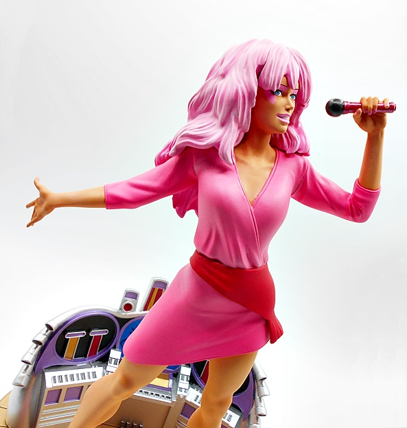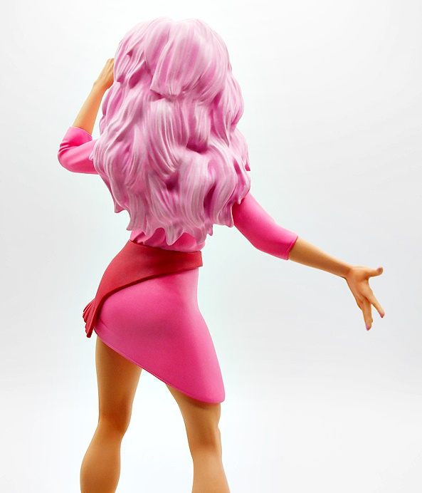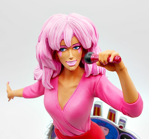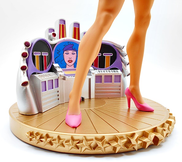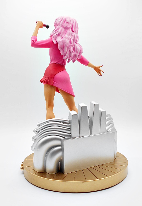 Here she is standing up on the stage, rocking out, and looking well… Outrageous! The figure comes as one piece and all you have to do is peg the rod on her left foot into the base and she’s ready to go. I’m really going to go into full-on gush mode, because I literally love every last thing about this statue and the way she turned out. The pose is absolutely superb and ripped right from the opening of the cartoon. She stands with legs apart (oh god, does she have great legs!), microphone raised, her free hand open behind her and strikes a pose worthy of a magazine cover… or even a statue!