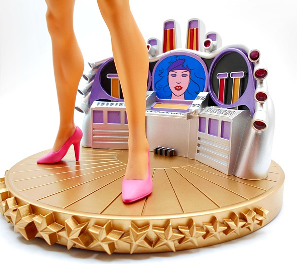 The base is also an inspired piece of work with the Synergy computer behind her on the circular stage. The computer casing is painted in a nice metallic silver and you get some purple panels and frames around the displays, and the sculpted musical keyboard and foot pedals. And best of all you get Synergy’s image in the central monitor, which looks like it was ripped right out of the cartoon. Don’t get me started on the huge disparity between Synergy’s doll and her cartoon look. I never liked the look of the doll and that’s why I don’t have it in my collection. Well, that and it’s pricey and hard to find in good condition. The satin gold finish on the stage is quite striking, and you’ll notice they left the stars on the front gold instead of painting them red like shown on the box. I’m all for the change. I think what we got just looks classier.
