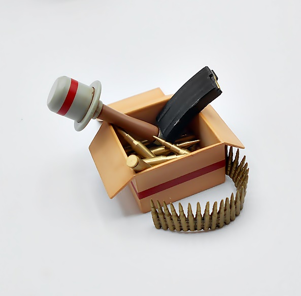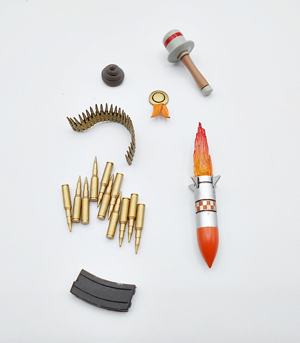 You also get a whole pile of other extras and a box to keep them in. The biggest item here is the rocket for the RAWKET LAWNCHAIR upgrade. I think Tunshi missed an opportunity here because the blast effect part isn’t compatible with the tube under the gun and it isn’t removable, so it’s hard to really incoporate this piece into the display. Other bits include a magazine, an ammo belt, a medal, a lump of shit (no really!), and eleven metal cartridges.
