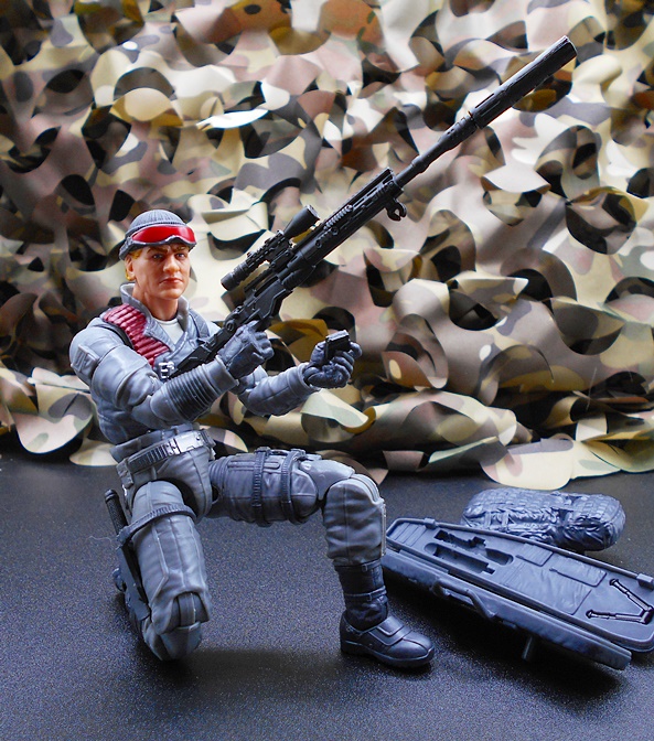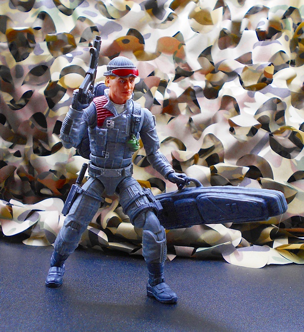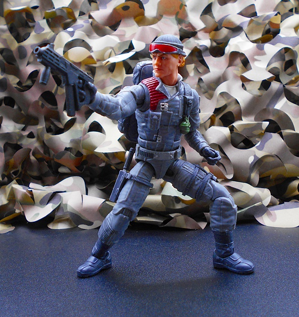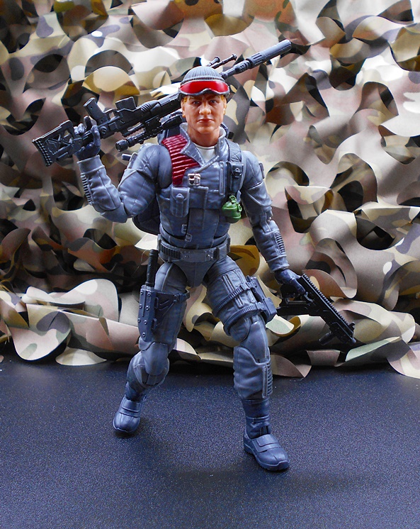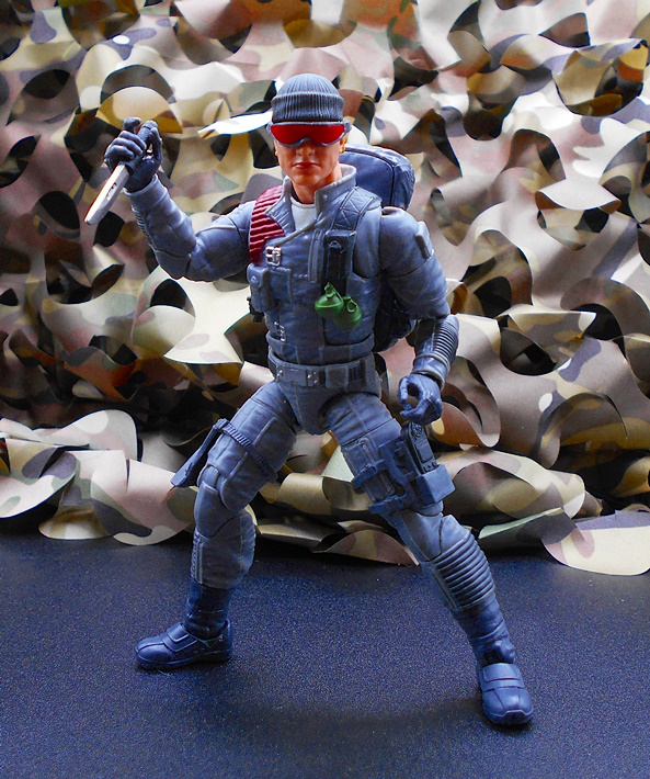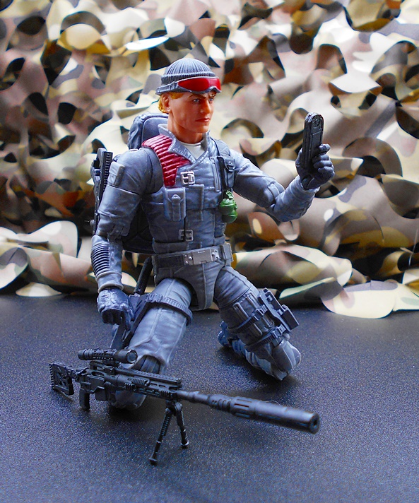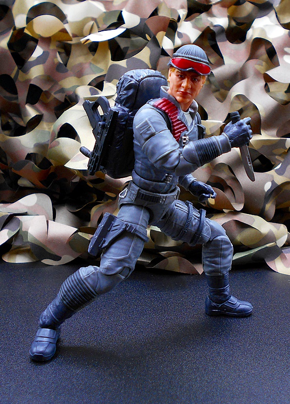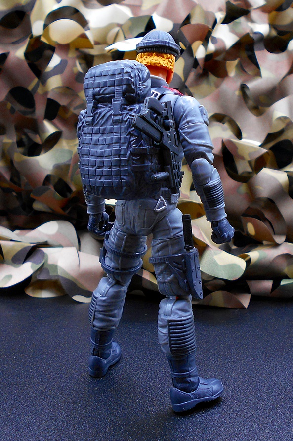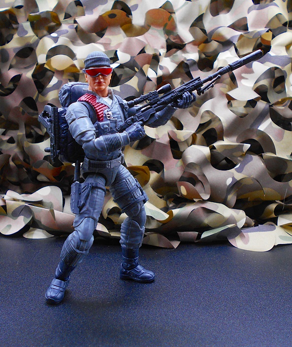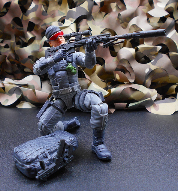 Once again, Classified draws heavy on the original RAH design for the character, and all I can say is, keep it up guys because that’s what I’m here for! Low-Light has a set of gray-blue fatigues with reinforced patches, zippers, pouches and sculpted detail pretty much everywhere. The boots and gloves changed from black on the original figure to blue here, and it looks fine. You get some snappy silver paint on the buttons and clasps, green on the pineapple grenades hanging on his left front, and red paint on the quilted recoil pad on his right shoulder. His right leg has a sheath rig for his knife while his left leg has a pouch for his wind meter. The tactical backpack pegs into his back and has a peg on the side to hold one of his guns. What a great looking update to the original figure!
