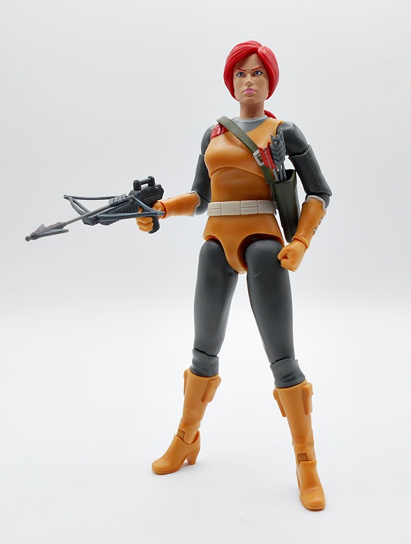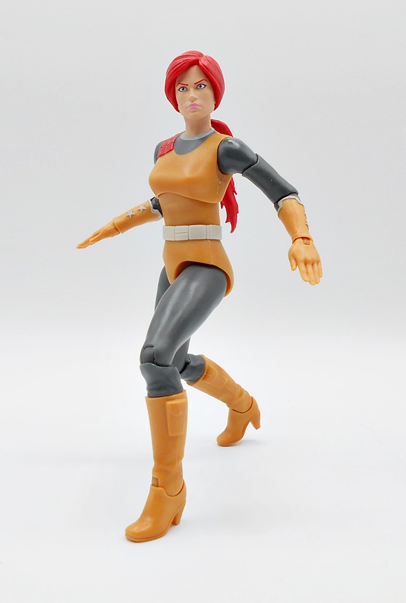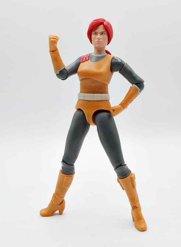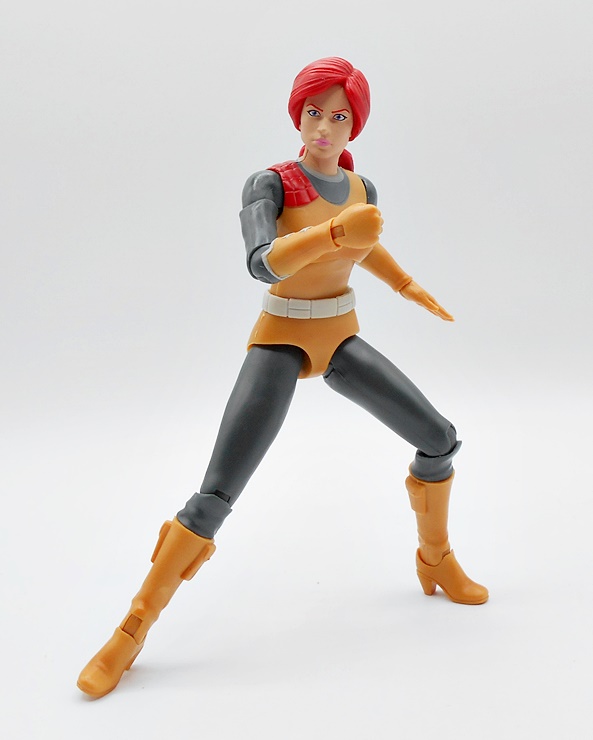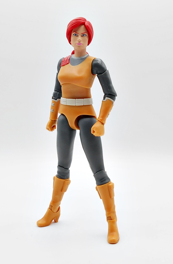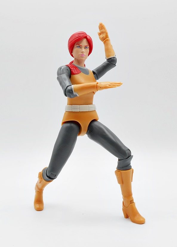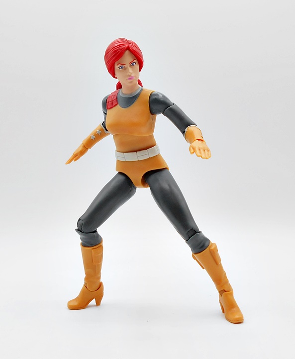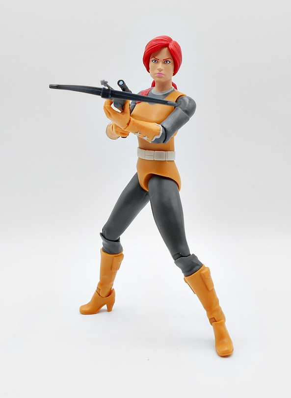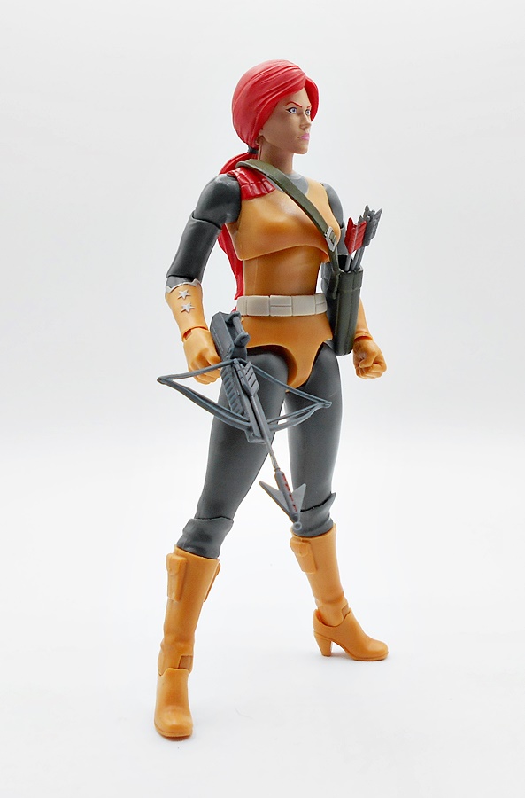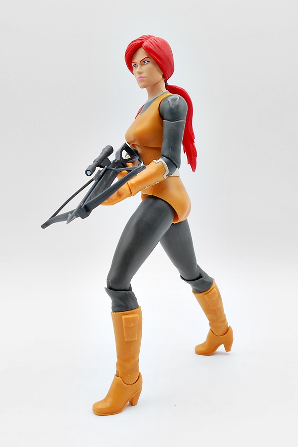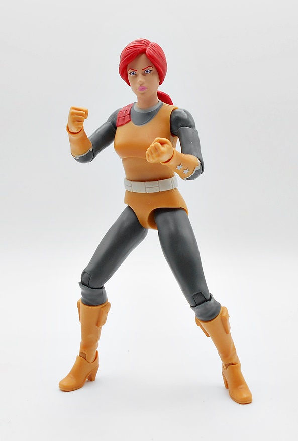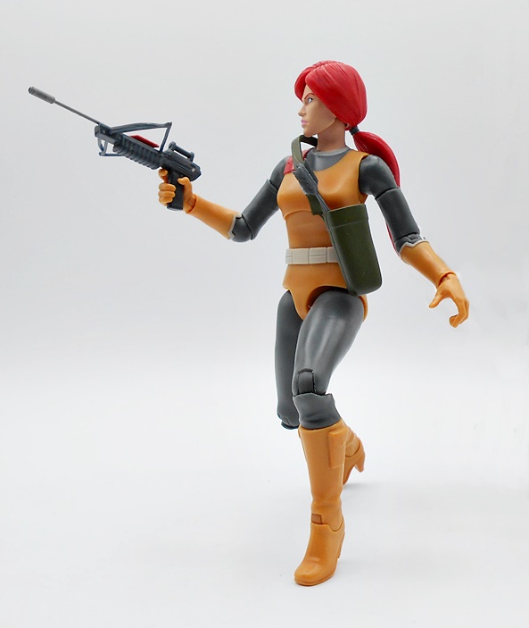 Sunbow Scarlett’s outfit came pretty close to the original figure’s design, with a tan one-piece, gloves and high heeled boots along with green sleeves and leggings. The figure sports a fairly minimalist look when it comes to detail, and that’s in keeping with the cartoon style. She has her familiar red recoil pad on her right shoulder, some silver shuriken and edging on her gauntlets, a wide silver belt, and some sculpted pouches on her boots. I would have liked a little more definition in her caboose, but all in all I really like what we got here when it comes to the body and outfit.