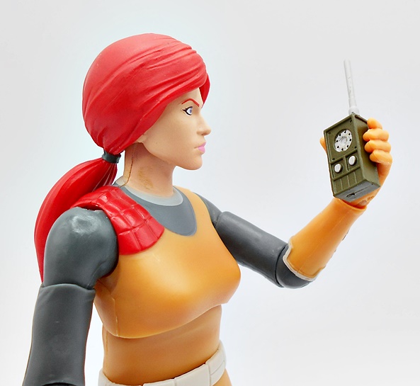 Scarlett’s final accessory is a walkie-talkie, which seems to be a popular pack-in for most of the Ultimate JOEs. Not that I’m complaining, it’s a good accessory for infantry to have. This one looks pretty cool and retro with it’s boxy design and it’s classic design speaker. The left hand that can cradle her weapons can also hold the walkie pretty well, but the elbows won’t let it get too close to her face.