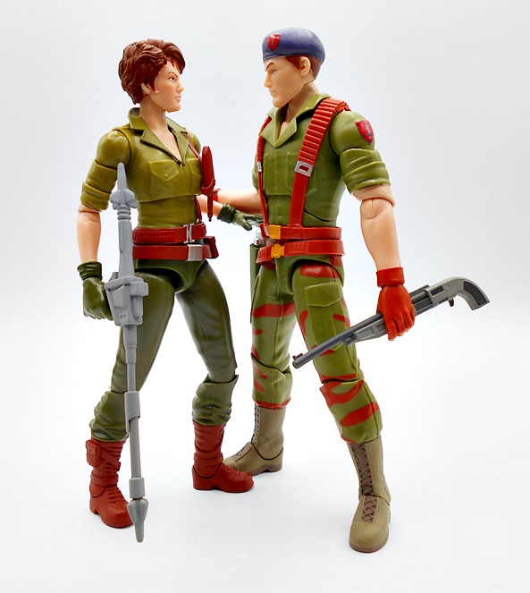AND NOW BACK TO GI JOE… and Lady Jaye! Like Flint, Lady Jaye is a really nice representation of her cartoon counterpart. You get the light green low-cut blouse with blue shoulder patch and sleeves rolled up past her elbows, darker green short gloves, dark green trousers, and high brown boots. She has a pair of belts, each with silver painted buckles, a knife sheath suspended vertically on a left shoulder strap, and the canteen on the back of her belt is pegged in and can be removed. The outfit and body sculpt look absolutely fantastic! As for articulation, you get the same stuff as we saw with Flint, with the main difference being Lady Jaye having a ball joint under the chest rather than an ab crunch hinge.