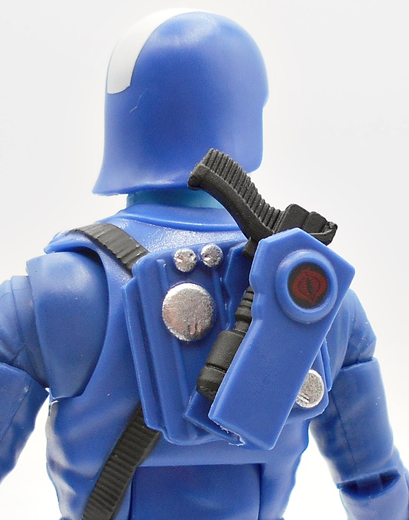 The backpack holster does it’s job well. The sleeve is sculpted to hug the contours of the weapon and it stays put just fine. You get some silver paint hits to whatever those buttons are supposed to be and there’s a Cobra emblem on a black field inside the disk on the outside of the holster. This backpack actually has one additional paint hit that is missing from the HasLab release.