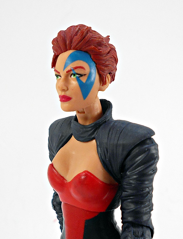 I think the portrait turned out great. Kitty looks a bit displeased, and while I’ll admit the expression falls short as you punch in close with the camera, it looks fine with the naked eye. The face printing is crisp and clear, They did an especially nice job painting the glimpse of teeth through her lips. The hair sculpt is also fantastic. It’s sculpted separately from the head to give it a clean hairline, and I love the way it hangs down over her right eye and sweeps back behind her left ear. She has a sculpted choker with a single red oval stone. The choker is painted to match her bodysuit, although this is one area where the paint could have been sharper.