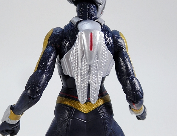 The masked head is a separate piece from the hood, allowing for it to articulate fairly well. The face mask is mostly featureless, except for the red “eyes” which pays homage to the comic version of Ghost. And like those blue points on the body, the red paint here stands out beautifully against the otherwise colorless figure.