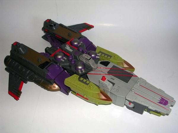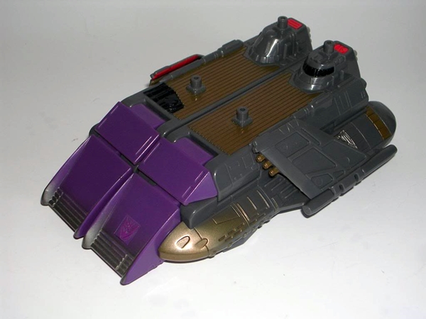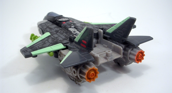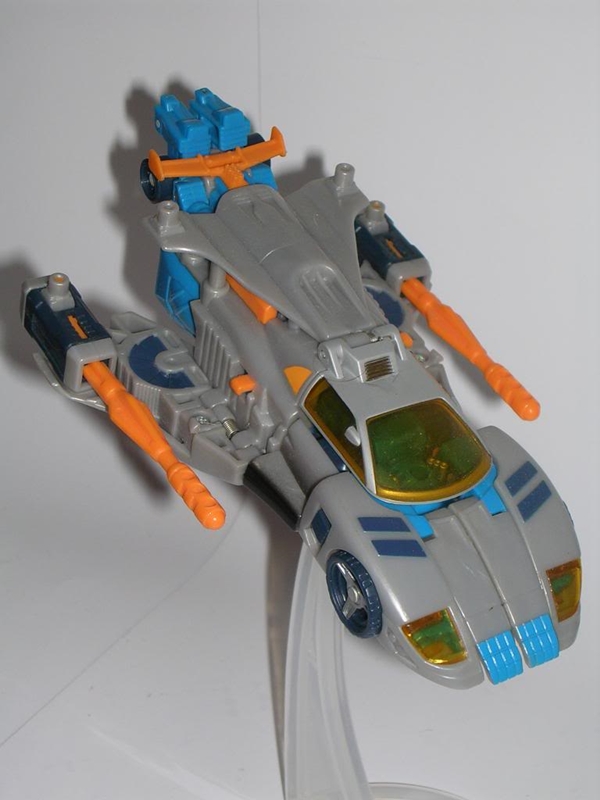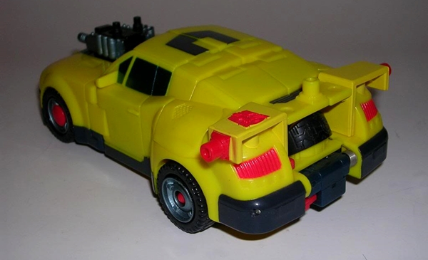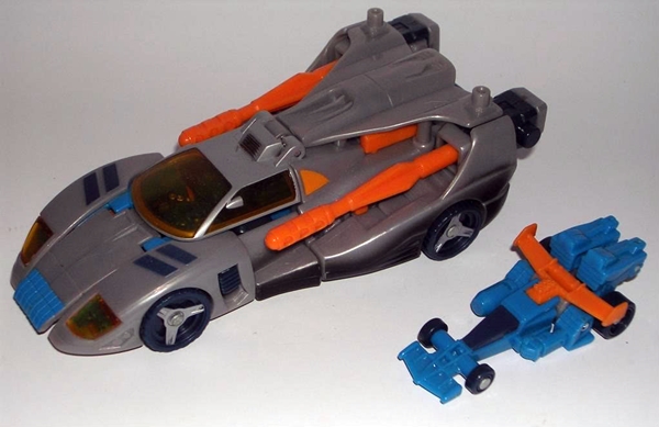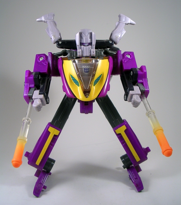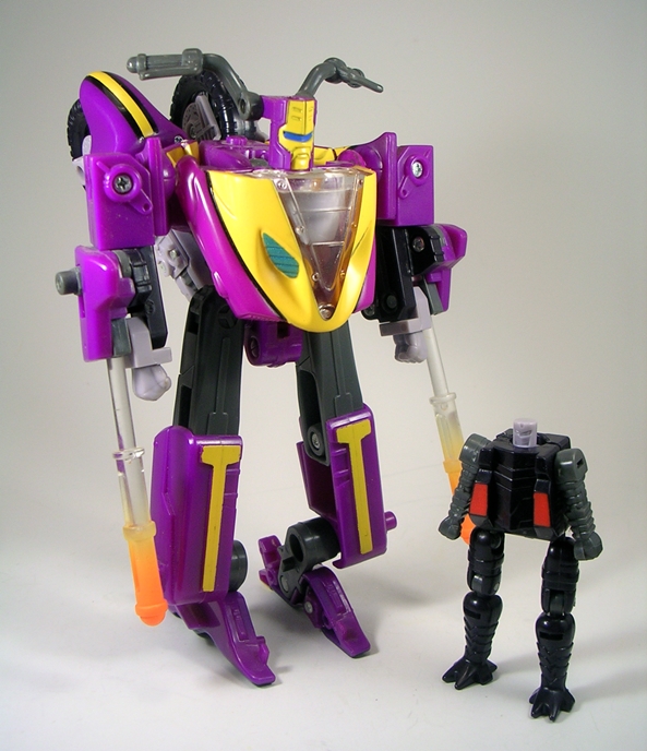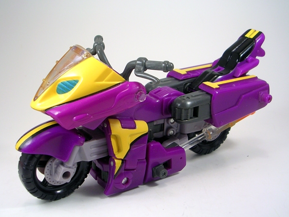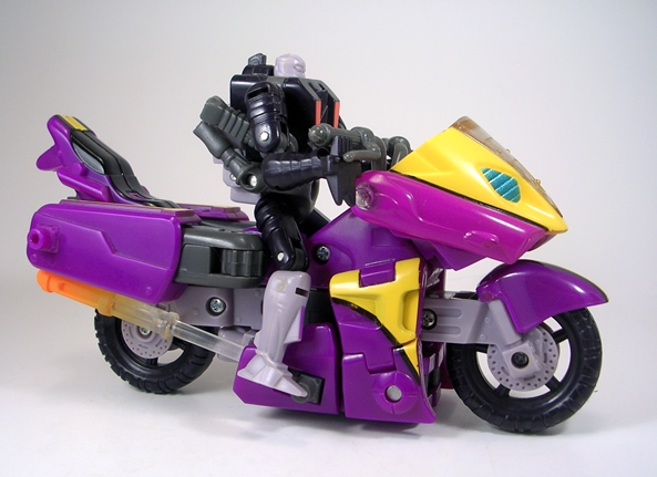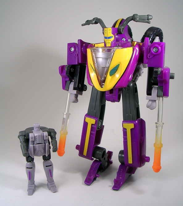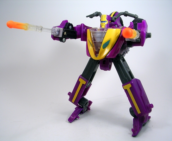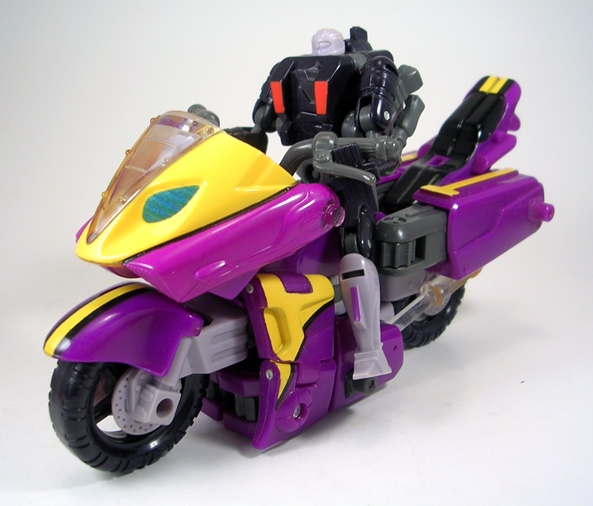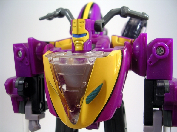 Sidways is a purple and yellow sports cycle. Ah, it’s all coming back to me now… “back on Cybertron they called my Sideways. I guess I’m a bit of a drifter.” No, Sideways, you’re a bit of a douchebag! I don’t remember a lot about muscling my way through the Armada cartoon, but I do remember hating this guy with a white hot passion. Him and that damn butt-rock guitar riff that they trotted out every time he was on screen. Was he an Autobot? Was he a Decepticon? Who cares? In the end he was dick. Of course, I got the toy before I ever saw his character in the series, so I just figured his faction swap gimmick was something like Punch and Counterpunch. And I kept believing that even after I was shown different in the cartoon.