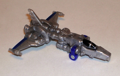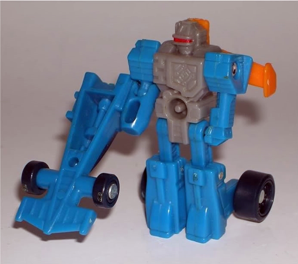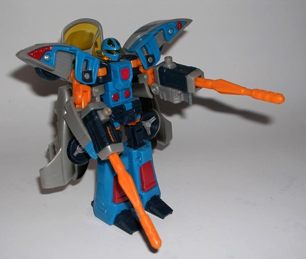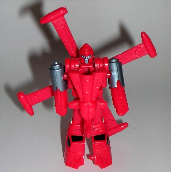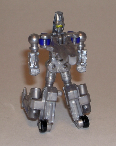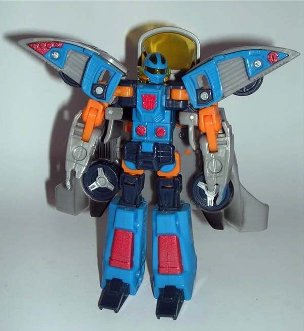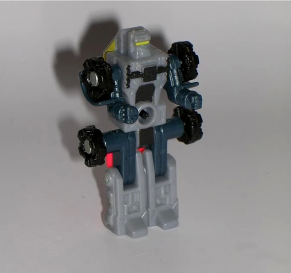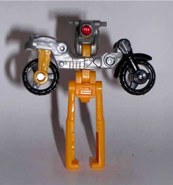 He also sits on the bike rathe well, thanks to the assistance of a tab that comes out of his butticular region. He also has little notches in his hands so he can sort of grip the handle bars. All in all, this is some pretty good engineering for a 10 year old line of Transformers and I’d like to see Hasbro try something similar again. Ok, let’s lay these two crazy little bots aside for a moment and look at Sideways in his robot mode.