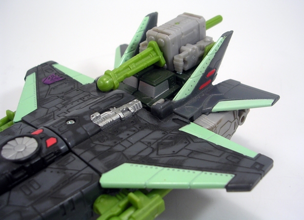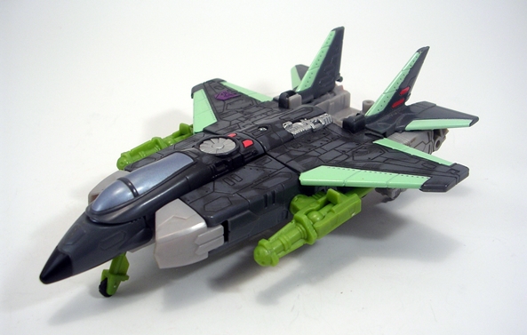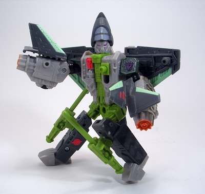 Call me crazy, but I dig it. I always have. I get a major later-G1 toy vibe off of this guy. His transformation is quite simple, but all the more clever for it. The way the front of the bike becomes his chest works really well and I love the way his translucent neon exhaust pipes become arm mounted missiles. Cool! I also love the way his wheels fold up and pack on his back. I’m a big fan of symmetry in my Transformers and such a characteristic is sadly lacking from a lot of transforming motorcycles. The only thing that throws off Sideways’ symmetry are the wheels peaking up over his shoulders, and I can live with that. Did I mention how much I dig the paint and deco on this guy? I think I did, but it’s worth repeating because it serves him just as well in robot mode.