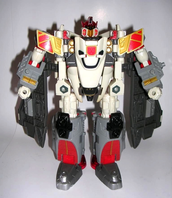 But Hasbro still wasn’t done with the mold, as they re-released it yet again, this time with a bit of retooling, as Buzzsaw in the Cybertron lineup. Buzzsaw featured a new cockpit and worked with a Cyberkey instead of a Minicon. He also had a crazy yellow, white and purple paint job. Buzzsaw also got a brand new headsculpt, which was a big improvement over Cyclonus’ mug.
