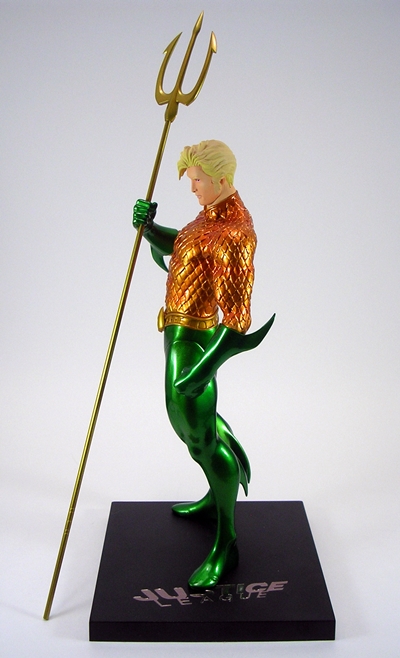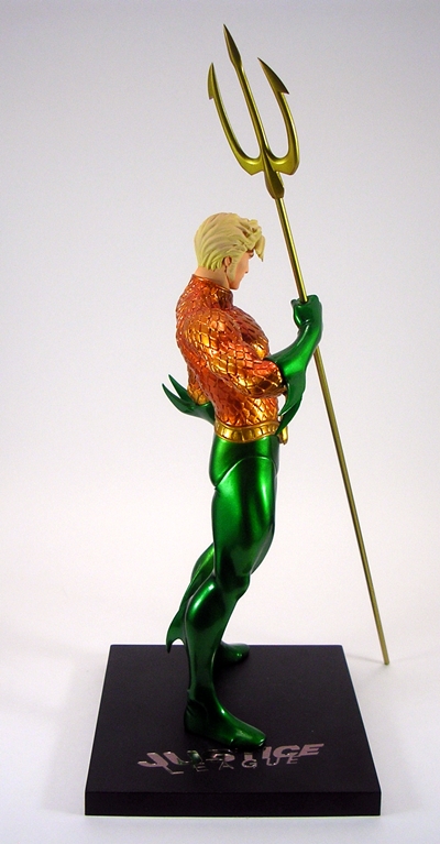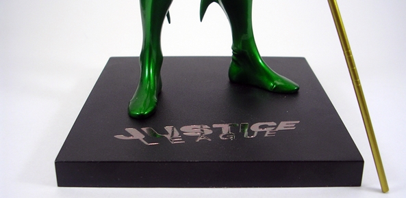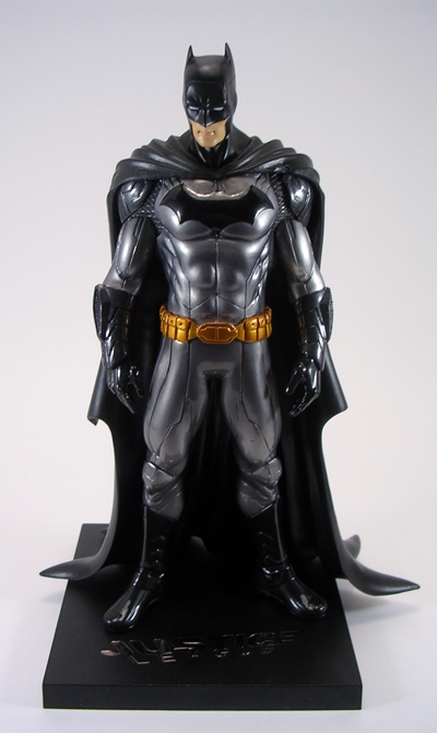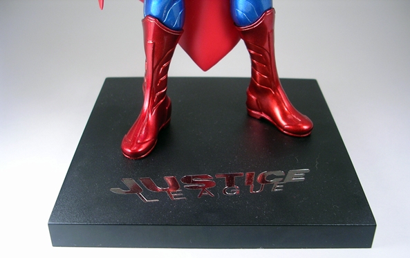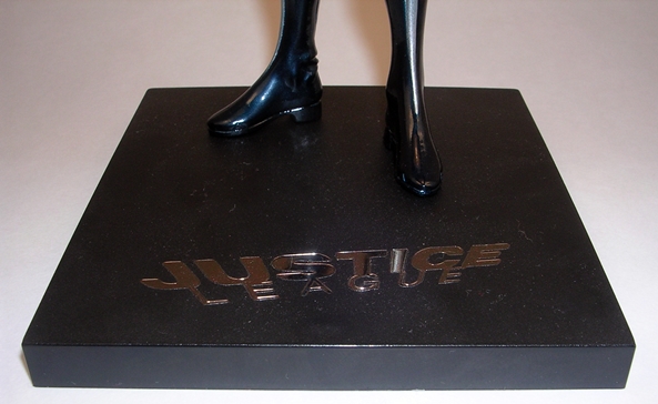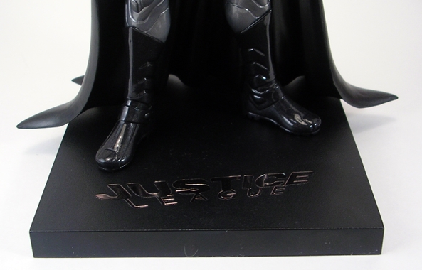 And as with all the statues in this line, Batman comes with a black metallic square base with the “Justice League” logo on it. The magnets in his feet mean that you can position him anywhere on it, or even straddle two bases to customize your display to your liking. Of course, with Batman’s solid stance and cape, he stands just fine on his own.