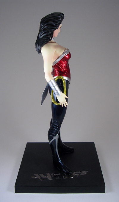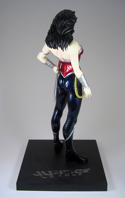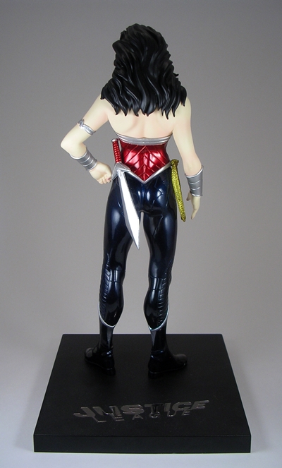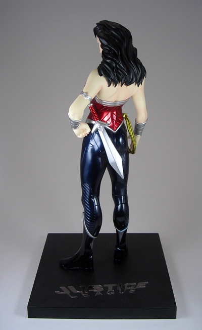 In terms of composition, Batman is the closest of all the statues to what I would consider a “museum” pose. He’s just standing there, arms at his side with his head cocked down a little bit. This piece doesn’t have that same sense of coiled energy or anticipation of action as the other statues, but that’s not a criticism, because in this case it just lets me take in that amazing suit. Many people have complained about the panel lining armor that makes up some of the “New 52” Justice League costumes, but nowhere is that armored look more appropriate than on Batman here. Besides the cut panel lines in his costume, the detail on the gauntlets and boots is particularly well crafted, as are the individual pouches on his utility belt. Even the internal webbing under his shoulder armor has been clearly sculpted.
