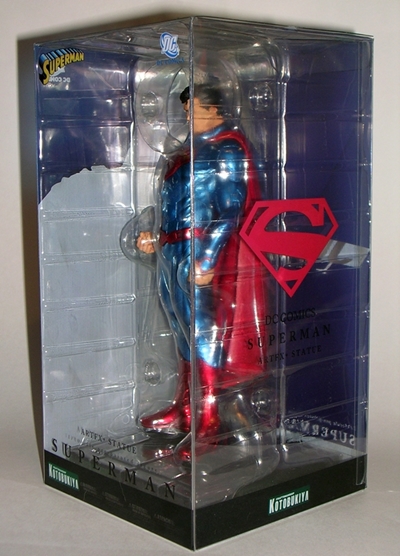 There’s the packaging in all its great-looking but fragile glory. I still have not decided whether or not to try to keep these boxes. I doubt very much they will endure storage very well and I don’t have the shelf space to display the statues in front of their character artwork. It’s also worth noting that Batman’s box is obnoxiously large compare to the others. It’s odd because he isn’t much broader than Superman, but I suspect it has to do with the bottom of his cape. Either way, this was the box that killed any ideas I had to display them in front of their linking character art, unless of course I decide to snip out those panels, which is always a possibility. Either way, Batman comes lovingly wrapped in plastic and with no assembly required other than placing him on his stand.