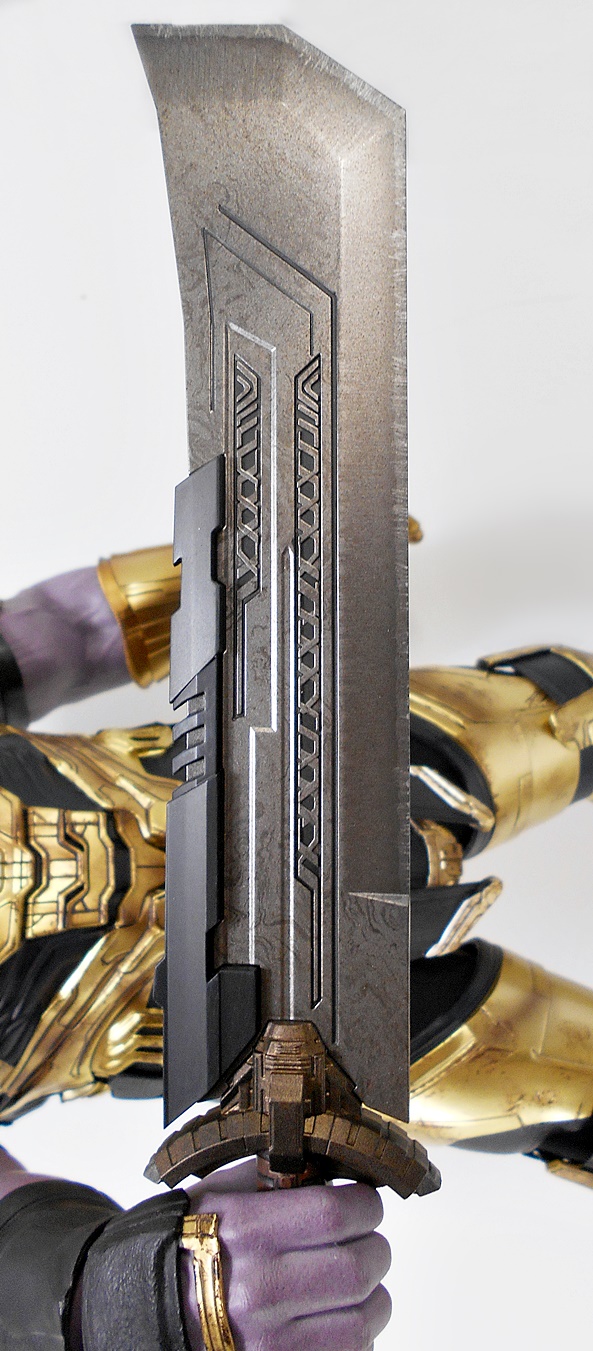 Thanos’ big accessory is his double-bladed sword, and it is indeed an intimidating weapon! When held vertically it’s taller than the figure and Hot Toys did a great job with this design. The blades have deeply etched designs on the flats of the blade and if you look really closely you can not only see a faint damascus pattern in the blade, but also the marks on the edges where it has been sharpened. That level of detail really blows me away.