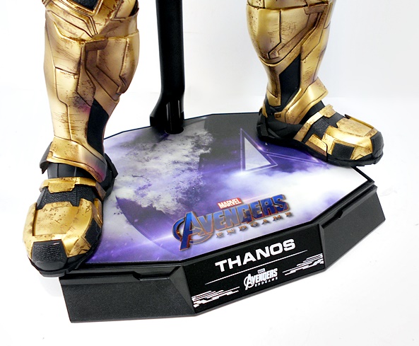 Finally, Thanos comes with a figure stand, which is similar to the regular Hot Toys bases, only a lot bigger. And yet it feels like it’s not quite big enough. In a moderate stance, Thanos’ feet hang over the edges of the stand. But it still works just fine. The base has a colorful image of the Avengers logo disappearing into dust and the logo proper closer to the front. The base has a nameplate on the front as well. I like the way it looks a lot, but I’m a little surprised they didn’t go for some kind of diorama base like they did for The Hulk.