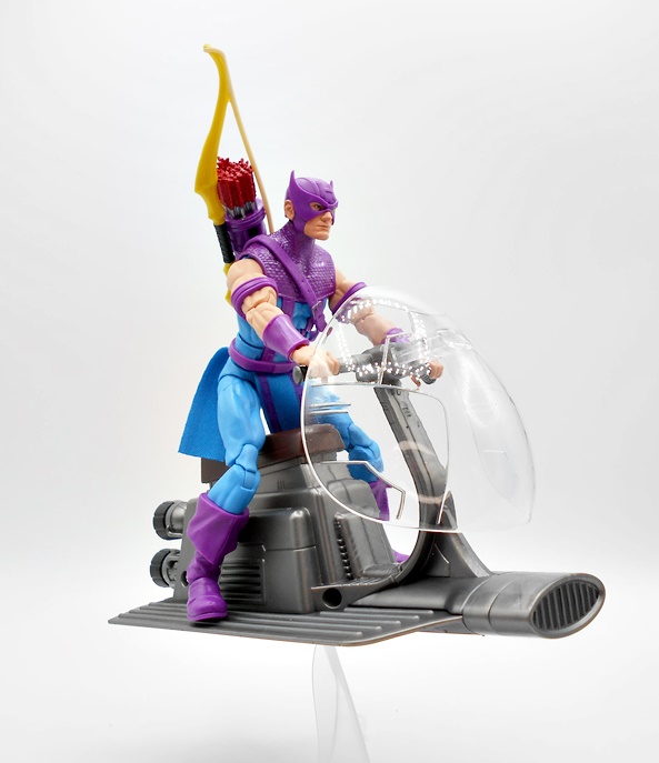 As for accessories, Hawkeye comes with his bow, quiver, and a single loose arrow. The quiver is the same one we got with the previous Hawkeyes I’ve mentioned, and I’m sure we’ve seen it at least one time before that. It’s a complex and modern design and I wish we got something more simple and traditional. The bow, on the other hand, is very simple, lending itself more to his classic look. It’s yellow with a black painted grip and a terrible, chonky plastic string. The arrow is mostly gray plastic with red painted fletching and a knob on the back to help the figure hold it. He can sort of pose as if he’s knocking the arrow, but with the string being plastic, he can’t draw it very well, so it doesn’t really work for an action pose. Let’s move over to the Sky-Cycle.