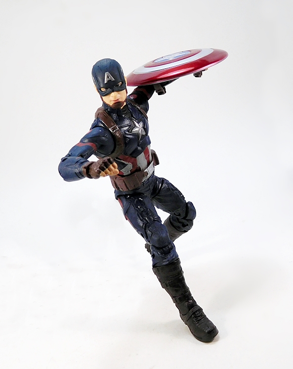 Obviously, Cap comes with his iconic shield, and it sure is different than the one that came with my First Avenger Cap! That figure’s shield had a high gloss, metallic finish that looked beautiful… for about a year and then the paint started flaking off of it. I eventually had to buy a third-party replacement. This time around, we get a more sensible, somewhat satin finish to the red, blue, and silver frisbee, and I think it looks great! The flipside is sculpted with reinforced plates and rivets, and has an arm strap and a grabber strap, which work very well with the figure, making it easy to put on and take off. Unfortunately, the straps still have working plastic clasps, which are so fragile I can all but guarantee will eventually break. Cap comes with the appropriate hands that will allow him to hold the shield on the left or right side. Unfortunately, there’s no way to attach it to his back, which seems like a huge oversight.