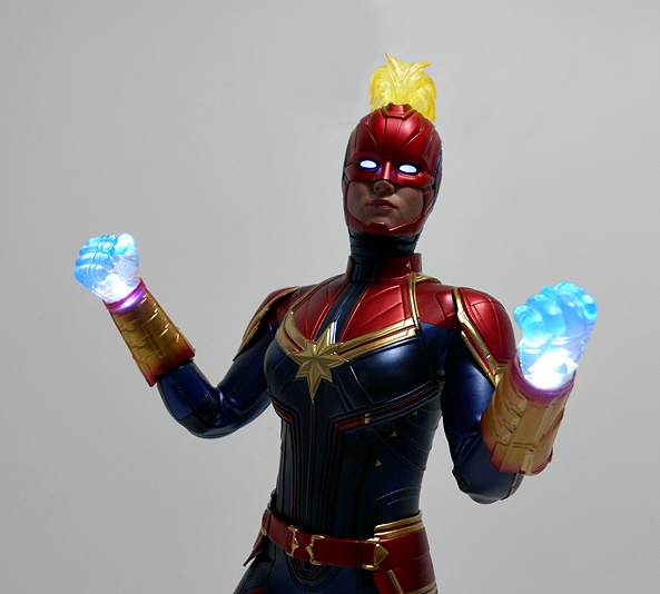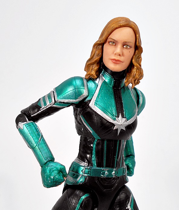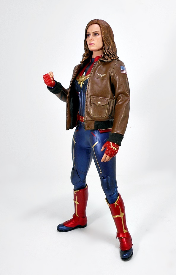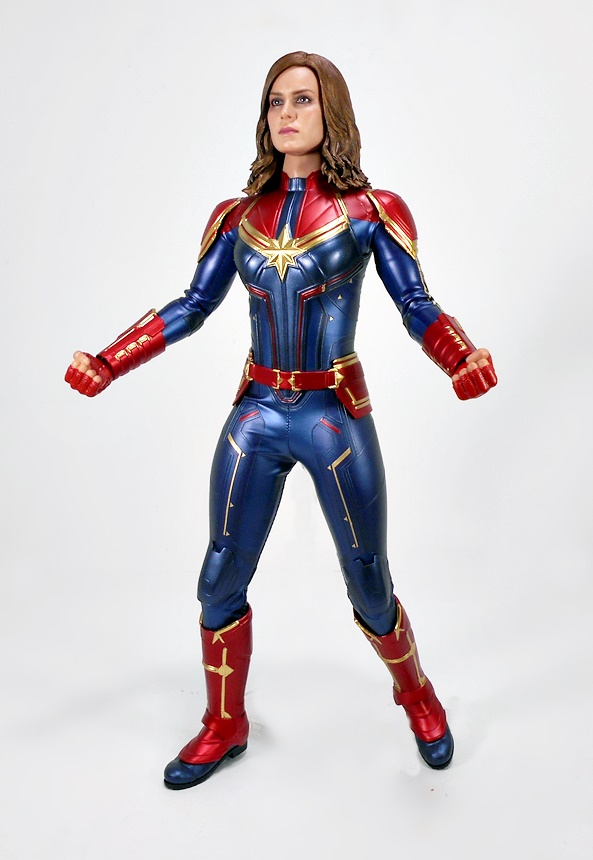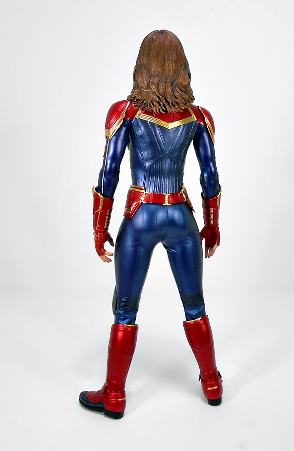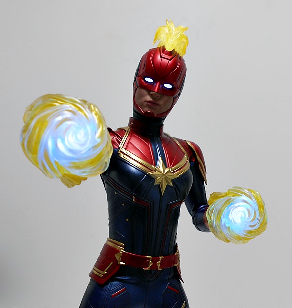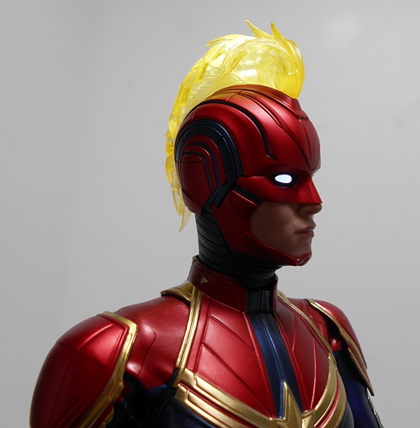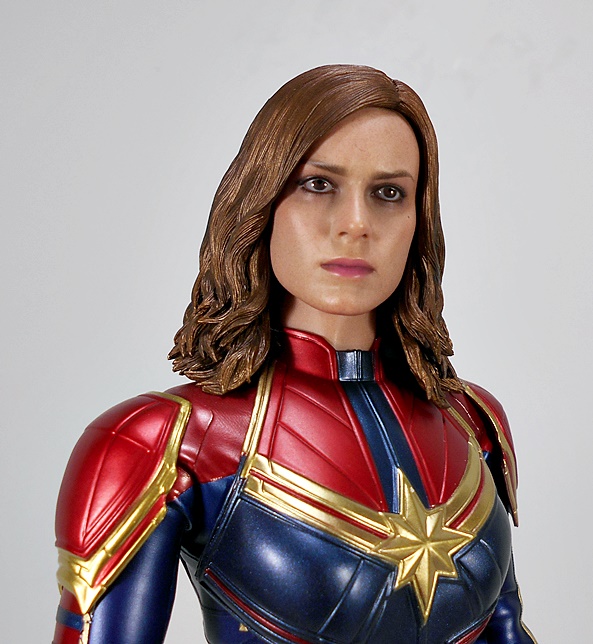 While I’d be willing to say the costume is perfect, I can’t be quite that generous when it comes to the portrait. Now, don’t get me wrong, it’s a beautiful portrait and I can see a lot of Brie Larson in there, but I don’t think it’s one of their strongest likenesses. At some angles it’s great, but at others it’s a bit harder to see. I wasn’t all that satisfied with Ms. Larson in the role (although she grew on me a bit in Endgame), so this is one figure where I’m willing to be more forgiving on the likeness, maybe because it’s not as important to me. With all that having been said, the paintwork is as good as ever and the level of realism in the skin tone and the eyes is superb. As for the decision to go with sculpted hair, I think maybe they should have gone with rooted hair here. It’s kind of weird to stand her beside my other Marvel Hot Toys ladies, all of which have rooted hair, and see her plastic coif. Then again, I’ll likely be displaying her quite often with her masked head, which we’ll get to in a bit.