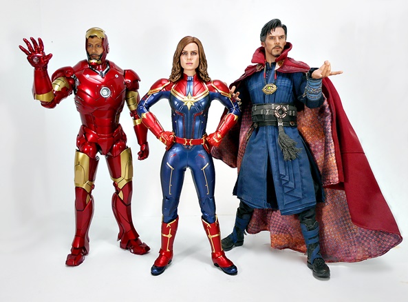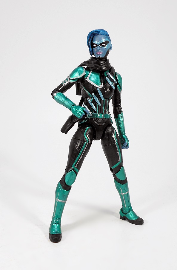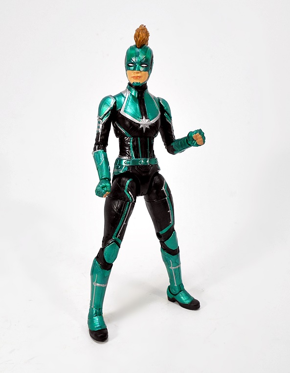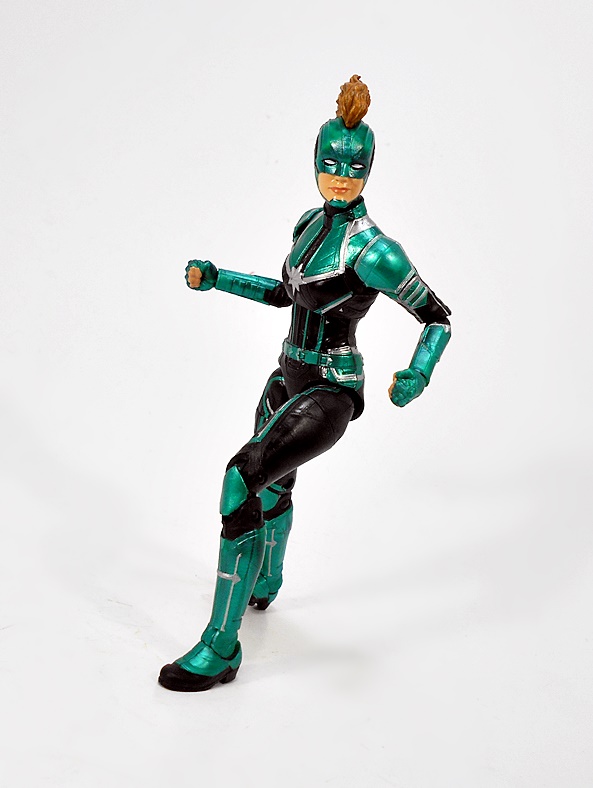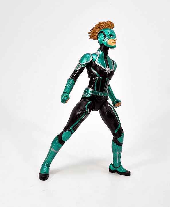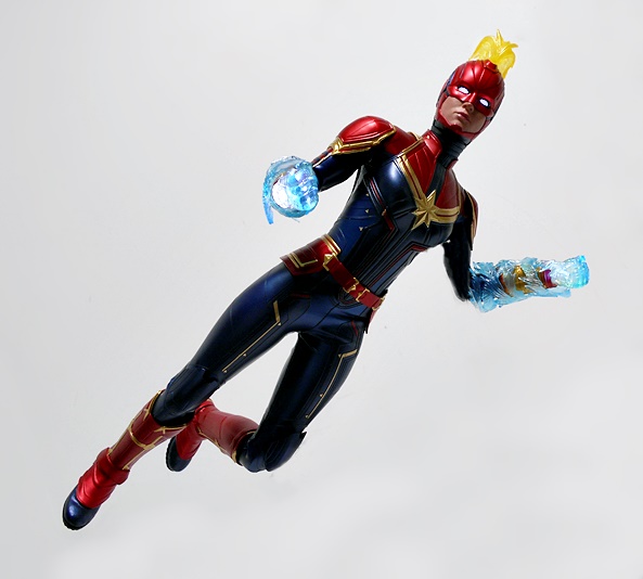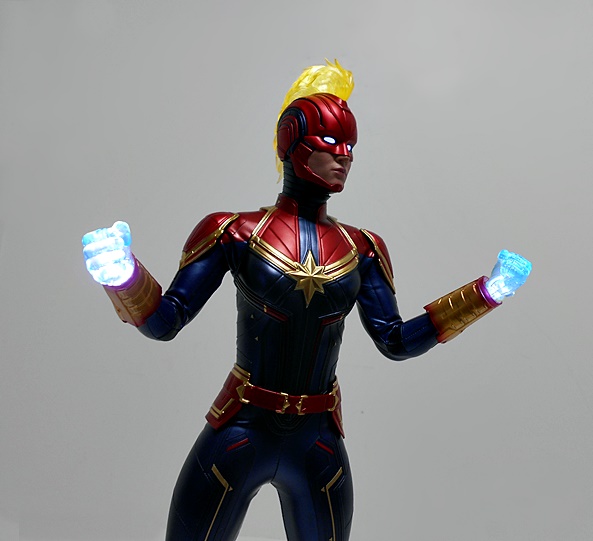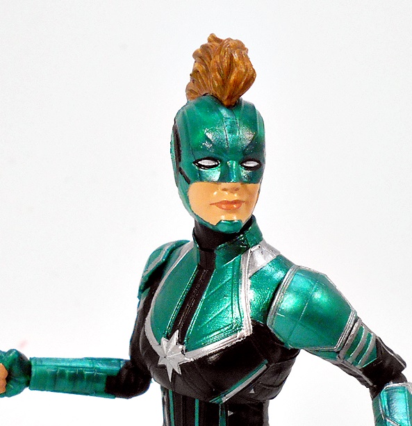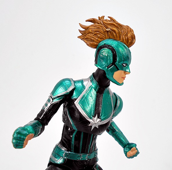 While I’d be willing to say the costume is perfect, I can’t be quite that generous when it comes to the portrait. Now, don’t get me wrong, it’s a beautiful portrait and I can see a lot of Brie Larson in there, but I don’t think it’s one of their strongest likenesses. At some angles it’s great, but at others it’s a bit harder to see. I wasn’t all that satisfied with Ms. Larson in the role (although she grew on me a bit in Endgame), so this is one figure where I’m willing to be more forgiving on the likeness, maybe because it’s not as important to me. With all that having been said, the paintwork is as good as ever and the level of realism in the skin tone and the eyes is superb. As for the decision to go with sculpted hair, I think maybe they should have gone with rooted hair here. It’s kind of weird to stand her beside my other Marvel Hot Toys ladies, all of which have rooted hair, and see her plastic coif. Then again, I’ll likely be displaying her quite often with her masked head, which we’ll get to in a bit.