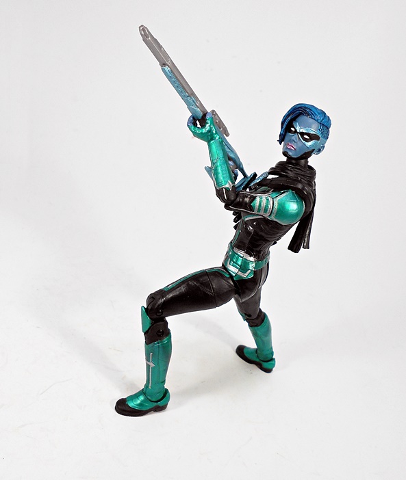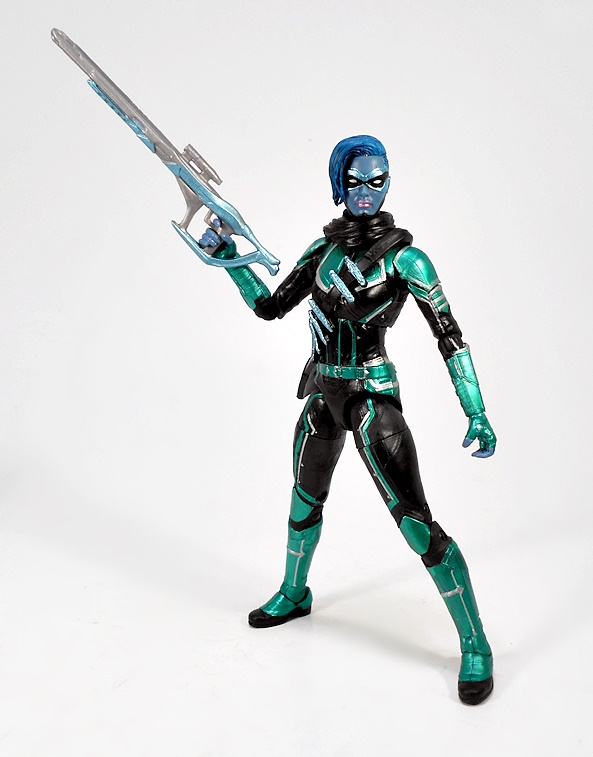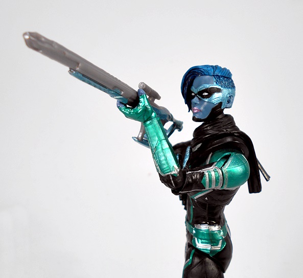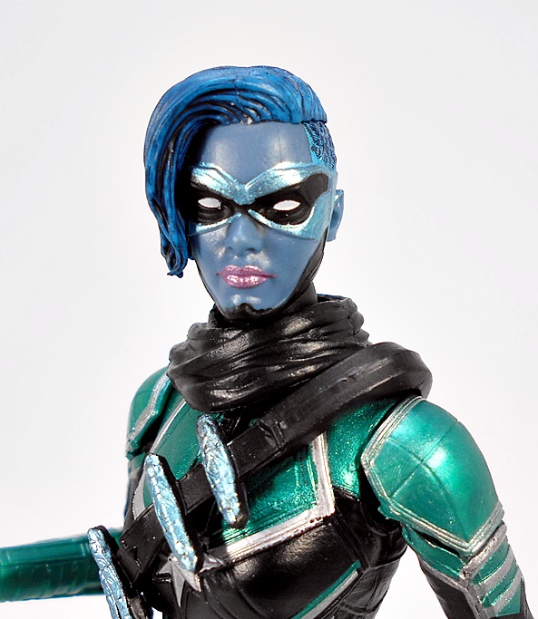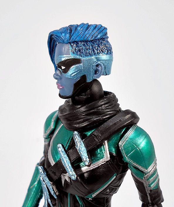 And as mentioned earlier, in addition to the extra hands, you get an extra head. Using this one involves also swapping out the neck post from the bare neck to the covered one that goes with the mask. Her sculpted cowl covers all but the lower part of her face. There are all sorts of cut panel lines in the cowl as well as more of that pretty red and blue to match the rest of the uniform. Her mohawk sprouts from the top and is beautifully sculpted. And now it’s time to turn down the lights a little bit so we can enjoy some of the light up features, this figure has to offer.