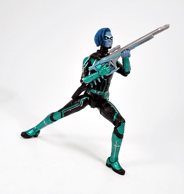 I just can’t say enough good things about how well the coloring on the costume turned out. It’s just pure eye candy. The blue and red have a sumptuously satin finish that pairs so well with the gold piping and trim. And I particularly love how the starburst on her chest turned out. Likewise, the stitching is immaculate and the suit is tailored so well that it looks like it’s practically painted onto the figure. And yes, that means it does hinder the articulation big time! I can get a decent range of motion out of her shoulders and elbows, but below the waist is limited because of how tight things are in the groin area. Even wide stances make me worried that I’m going to pop those stitches. When I get a figure like this, I tend to refer back to the official photos to see what the possibilities are and even those photos don’t go too far when it comes to dynamic leg movement.