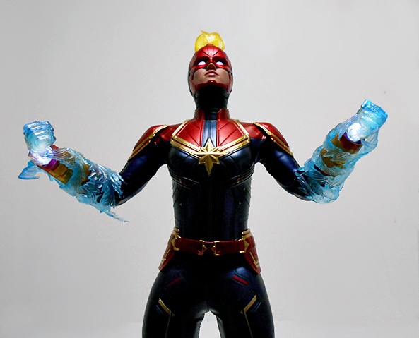 Carol also features a light up feature in her arms, which works in conjunction with a number of effect parts and a pair of arm bracers cast in brighter plastic to make them look like they’re channeling energy. Again, accessing the feature here isn’t too bad, and since you’ve got to swap out the fists anyway you’ll have access to the on/off buttons. First off, she has a pair of translucent fists, which light up brilliantly.