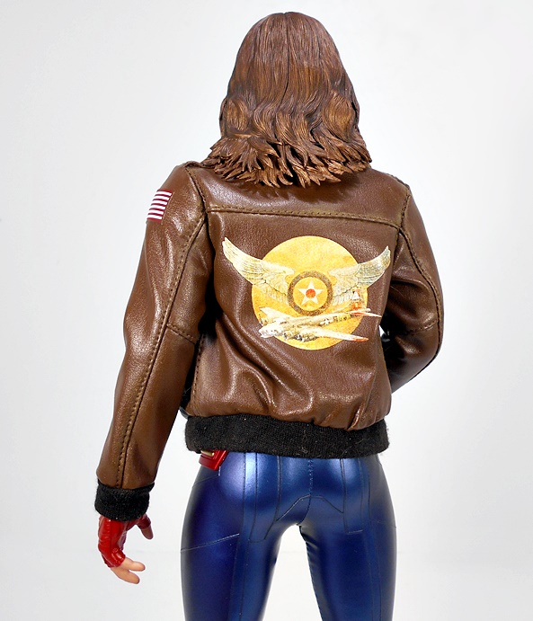 The first of the two Deluxe accessories is her leather bomber jacket, which fits right over her costume and is surprisingly easy to put on. The only thing to watch out for here is her sculpted hair, as the ends can be a little sharp and I can imagine it damaging the jacket if you aren’t careful, especially when turning her head. I also remove her arm bracers when she’s wearing the jacket, as it just makes it easier to put on. The jacket is a beautiful little garment and tailored to fit perfectly. It’s got soft elastic material around the lower edge and the wrist cuffs, a large patch on the back, a name patch on the front left of her chest, and an American flag patch on the left shoulder. I think this looks fabulous on the figure, and I’ll likely be displaying her with it when I’m using the unmasked head.