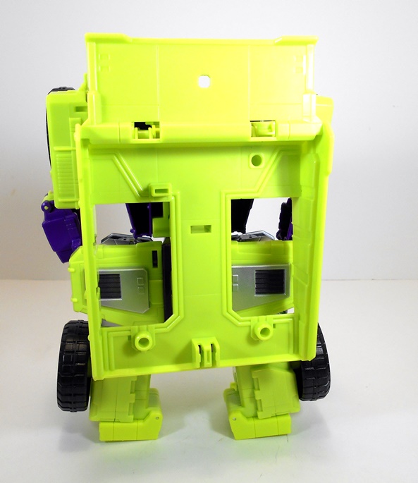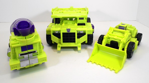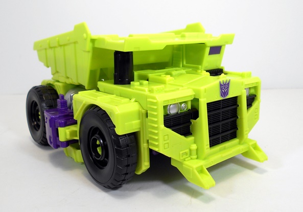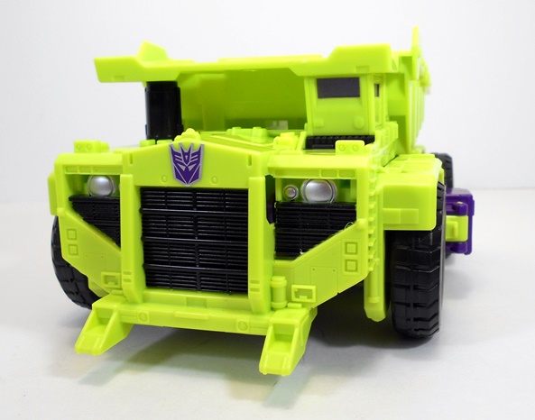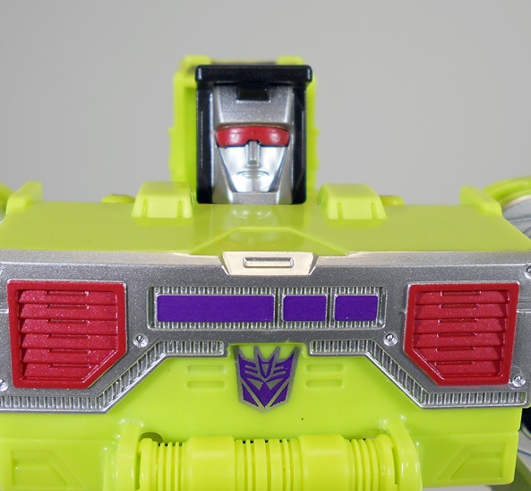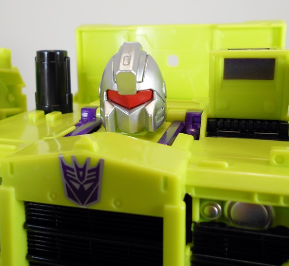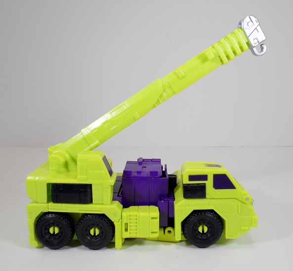And now we come to the big elephant in the room… Long Haul. Long Haul was my first Constructicon as a kid and so I have a special level of affection and nostalgia for this guy. He’s still a dump truck, and he’s a mighty big one, which makes me think of him as a hybrid of the original toy and the Revenge of the Fallen version. Besides being a big boy, Long Haul has some nice sculpted detail, and with some black, purple, and silver paint showing, he’s a little more dynamically colored, but you do still get an awful lot of neon green. I loved this mode to begin with, but once I got a look at that Decepticon emblem above the front grill, it was on a whole new level of greatness.