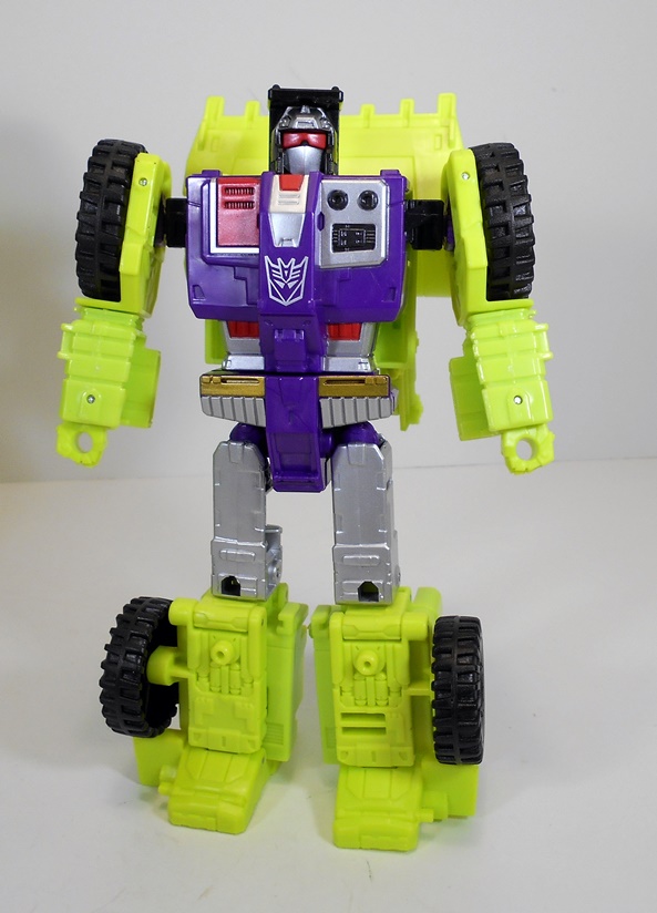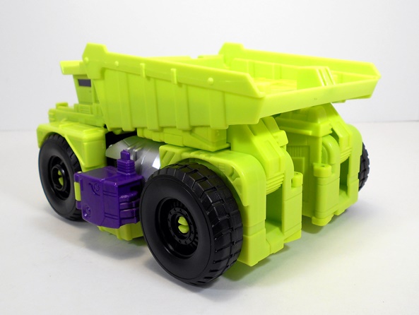 There are virtually no paint apps showing on Scrapper’s vehicle mode other than the purple on the windows and a Decepticon emblem on the roof. You do get a little hint of purple plastic peeking out here and there from his robot parts, the black wheels, and a whole lot of glorious neon green plastic. I’ve heard some people complain about the green being off. It’s definitely brighter and more intense than the original toys, but it works just fine for me.