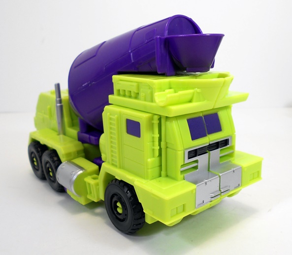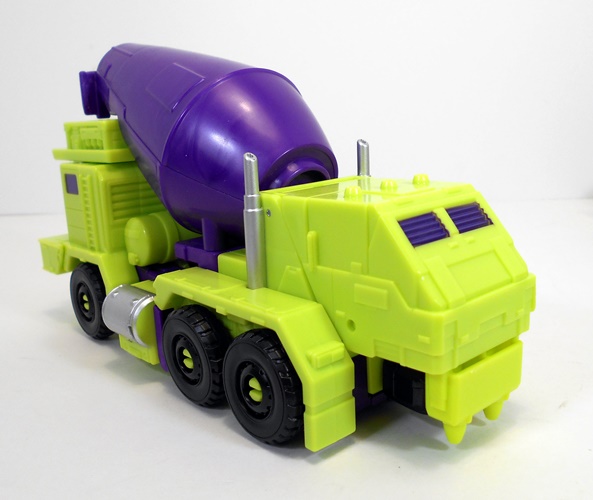 Moving on to Mixmaster, here we have a pretty big departure from the old G1 toy. He’s still a cement mixer, but a different style, with cabs on the front and the back. I’ve been told by someone who would know this is a legit design, but it feels so weird compared to the more simple G1 design. The drum is now angled up on the front, at least I think that’s the front. Holy crap is this a confusing design! You get the same black, purple and green deco on Mixmaster, with a little silver on the side tanks, front grill, and the smokestacks. In all honestly, he’s probably got just as much paint as most Deluxes shipping these days, and probably a few Voyagers too. Still, I can get behind this design, especially when the transformation preserves so much of the look of the original robot.