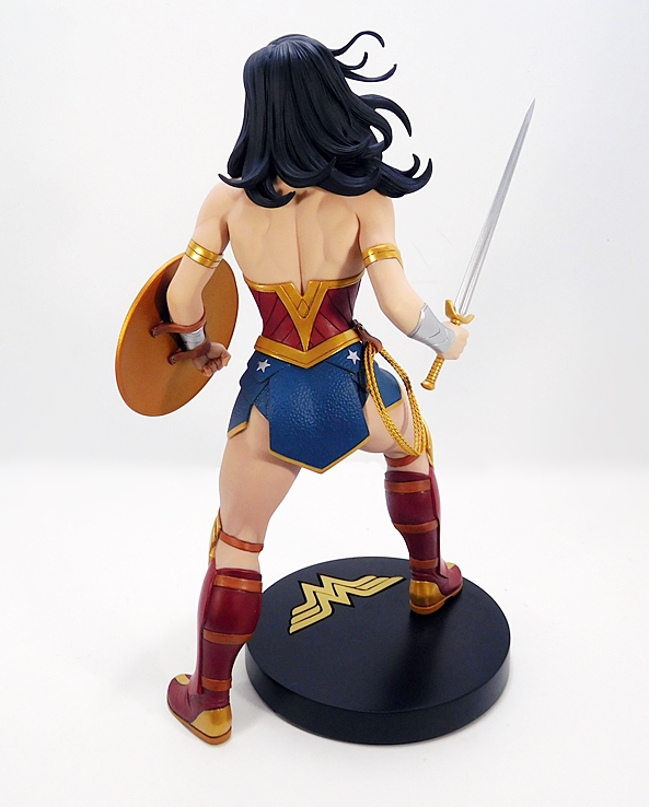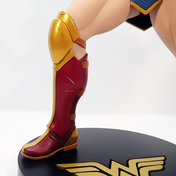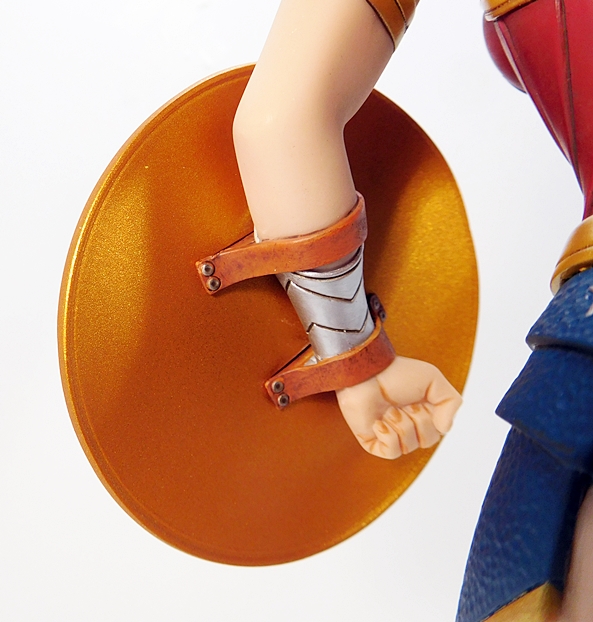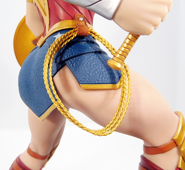 I love the proportions here and the beautiful curves of her pose. I think it would have been cool to have her raised leg kicked back into a tight bend, but I still love what we got. The previous Kara PF had a softgoods cape, at a time when Premium Formats almost always had some form of mixed media. I like that idea, but I can’t complain about the sculpted cape on display here. It flutters beautifully, giving a little more kinetic energy to the composition and you don’t have to worry about the material wearing or getting messed up. I also think they did a wonderful job on the boob window and I’m obviously a big fan! As for the colors, the blues and reds are deep and vibrant while the skin tone is warm and soft. The white one piece has a bit of blue wash to it, which I think looks very nice. Finally, you get the maroon belt and some gold leaf paint for the buckle and the cape braid.