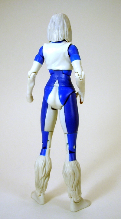 The rest of the figure fares a little better with a pretty good recreation of her costume. The top, the long gloves, and the shaggy leggings are part of the body sculpt and both are done fairly well. The rest of the figure utilizes a standard DCUC style female buck with blue paint added to the white plastic for the coloring of the costume. The paint lines are fairly clean, although the pegs for the knee joints aren’t painted blue to match the costume and that’s a bummer.