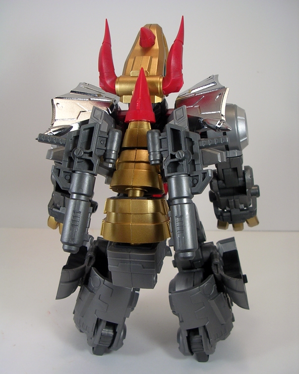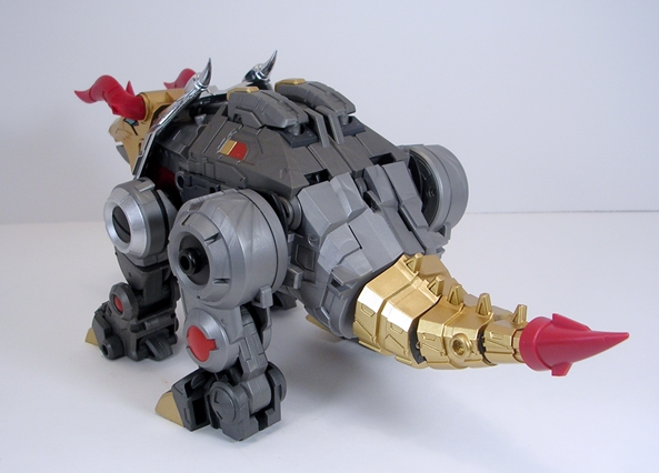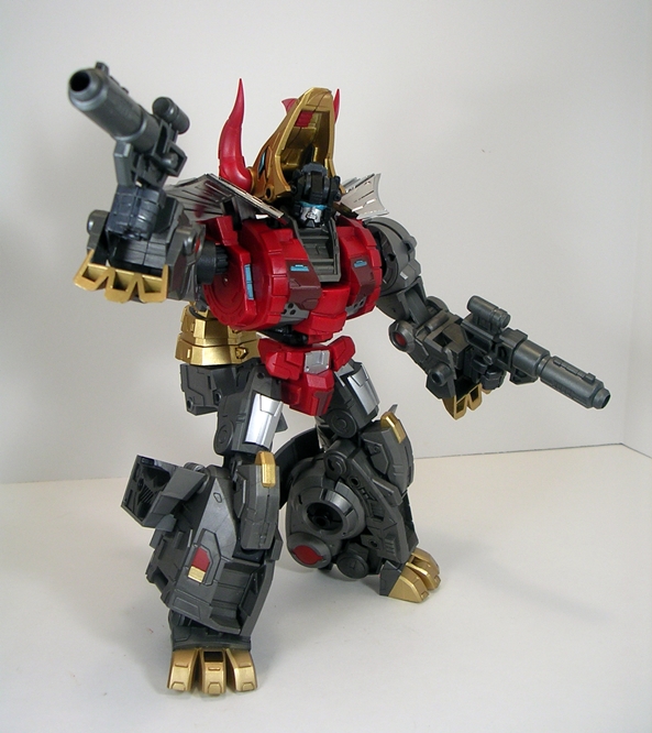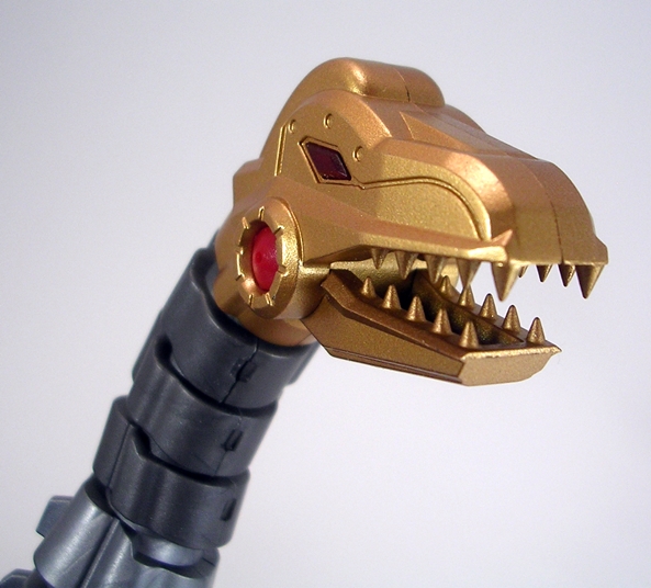 Behold, Severo in his robot mode. I freaking love this guy! He looks like a goddamn powerhouse and he walks that fine line between hitting all the important Grimlock tropes while still offering something of a unique edge to his design. The gold chest with clear chest-plate is easily recognizable, as are the dino claws that frame his fists on the tops and bottoms of his chunky forearms. The proportions on this big guy are perfect to me, and that goes a long way to make up for some of the sacrifices made to the T-Rex mode’s proportions. I think my favorite design element here are those high and massive shoulders. Not only do they look damn imposing, but they’re practical in that they help protect his head from getting knocked off in a melee fight. The robot mode retains a lot of the same deco as his T-Rex mode, but also adds some very bright red to his abs and pelvis.