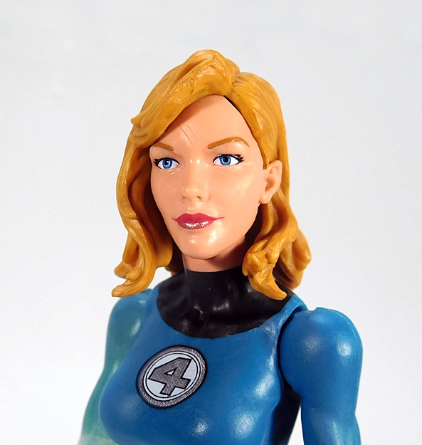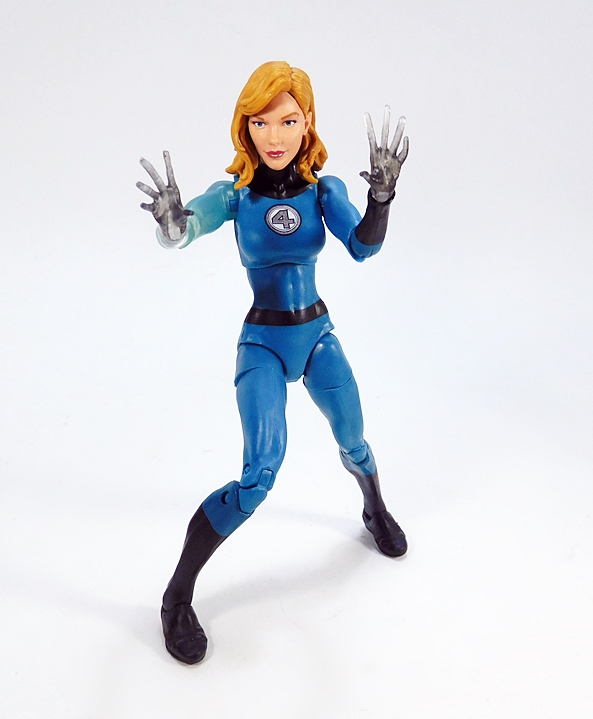And here she is, a very simple but lovely figure. Sue Storm features a standard female Legends buck with the entirety of her costume painted on. That is to say she’s blue with painted black boots, gloves, belt, collar, and her “4” emblem tampo’ed on her chest. The shade of blue is a fair sight paler than what Hasbro used for their Marvel Universe 3 3/4-inch Fantastic Four boxed set from a while back, but I still like it a lot.