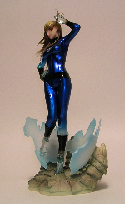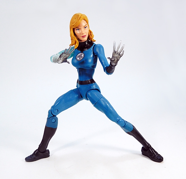 And here she is, a very simple but lovely figure. Sue Storm features a standard female Legends buck with the entirety of her costume painted on. That is to say she’s blue with painted black boots, gloves, belt, collar, and her “4” emblem tampo’ed on her chest. The shade of blue is a fair sight paler than what Hasbro used for their Marvel Universe 3 3/4-inch Fantastic Four boxed set from a while back, but I still like it a lot.