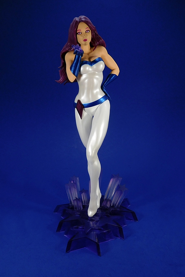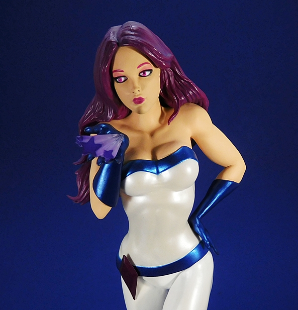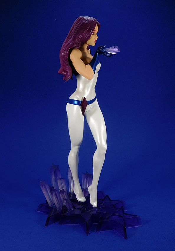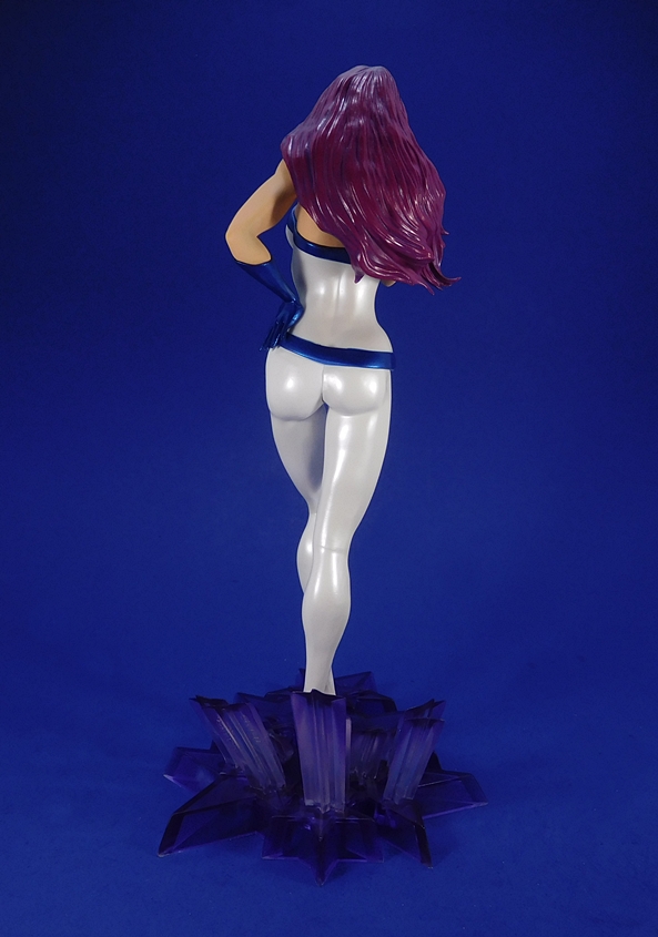 The paint on this piece is applied well, with sharp lines and very little bleeding or flubs. There’s a tiny bit of uneven line along her bikini bottom, but nothing I’m going to get upset about. I dig the high gloss coat used on the gloves and boots, the gold has a somewhat antiqued look to it, and the inside liner of her cape is a deep crimson. It wasn’t until closer scrutiny that I realized her top has a bit of a purple sheen to it. Her skin is chalky white with a hint of blue, and while it looks fine, I think the blue applied around the bottom of her breasts is a wee bit overstated. Yeah, I’m really looking hard to find anything to nitpick here. And as I’m often fond of observing with this line, I’ve seen far worse paint on much more expensive statues.