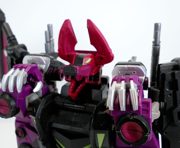 FP designed this bat mode to work either standing up or in flight with a simple adjustment to the head and both modes have their good points. Sigma-L’s little bat mouth is also hinged so that it can open. When standing on his little bat feetsies you can clearly make out the speakers that Sigma uses to beam hypnotic waves at his foes. So good! On the other hand, when in flight Sigma shows off his two shotguns quite nicely. Yes, we have here a robot bat with dual shotguns mounted to his wings. God, I love this toy!
