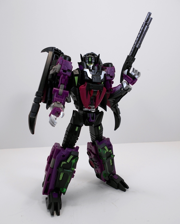 Sigma-L’s coloring takes what is an amazing sculpt and elevates it even further. You get those great traditional Decepticon colors of black and purple complimented by some beautiful silver paint, some redder purple plastic and a surprising bit of minty green trim, all capped off with translucent plastic on his legs. A lot of the coloring comes from the plastic itself, which is always a plus in my book, but what paint is here is precise and crisp making the colors look unbelievably good.
