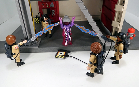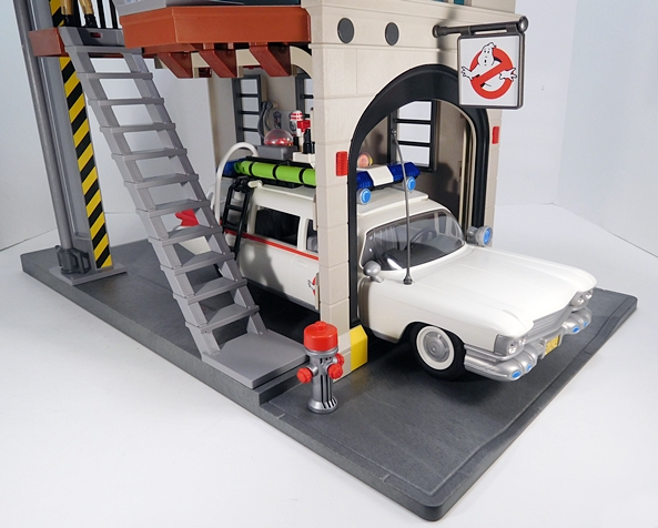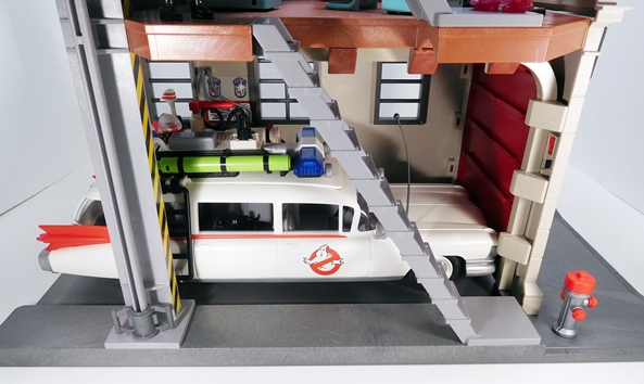That back area also features a Ghost-Capture-Claw, not doubt developed by Egon, to hook ghosts. By shifting the exhaust pipe left or right, the rope can either be locked, or it will retract as you push the Ecto-1 along. There’s also a hook inside to hang the claw from when it’s not in use. The orange ghost is included!
