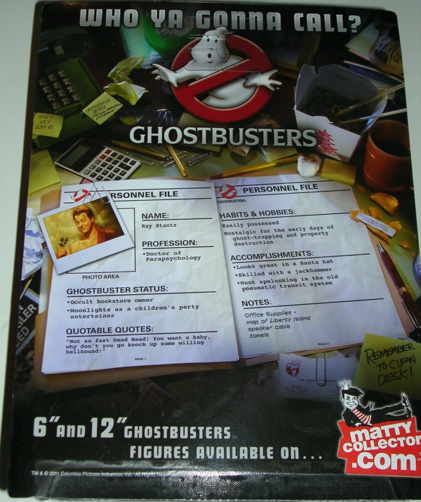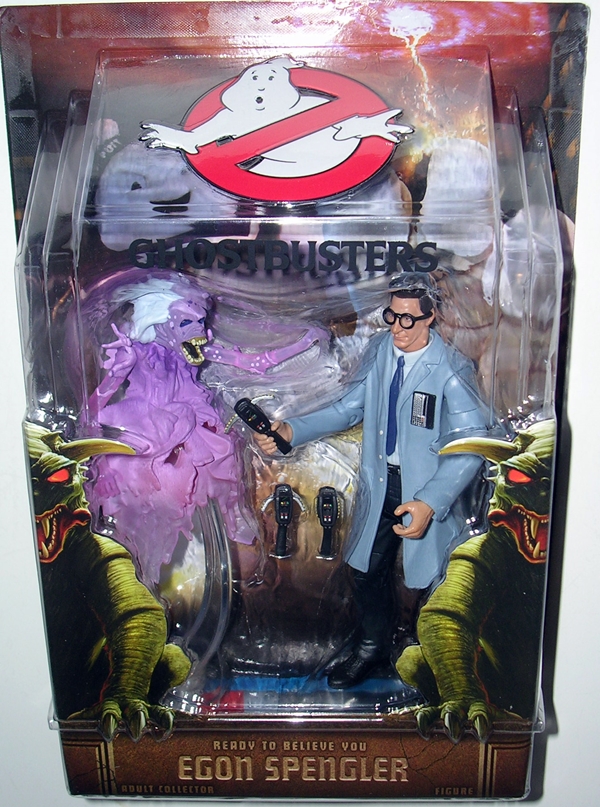 It seems oddly appropriate to point out today that Egon was actually the very first of the Ghostbusters to get the 5-inch treatment from Mattel. He appeared as a Slimed Variant Exclusive released at the 2009 San Diego Comic Con. Later he would get a wider release without the slime and yet again he was released as the figure we’re looking at today. While this line has had its share of critics, it’s hard to knock the presentation here. Egon comes packaged, along with the Library Ghost, under a huge bubble against a carded backdrop of the Stay Puft Marshmallowman. The Ghostbusters emblem is on the top and the bubble is flanked by the Keymaster and Gatekeeper. The whole package is big enough to sit right on your shelf and it looks good enough to leave in the package and display it as is. But y’all know me… let’s rip this baby open.