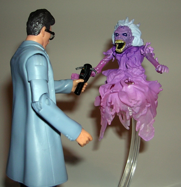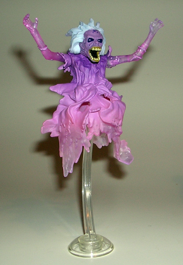 What else made this figure a very worthwhile purchase was the inclusion of the Library Ghost, or Eleanor Twitty if you prefer, from the beginning of the original film. This free-roaming vaporous full-torso apparition is beautifully recreated in partially translucent plastic. The face sculpt is awesome right down to the swept back grey hair and messed up ghoul teeth. I really dig the paintjob on this figure too. The mix of matte purple with the translucent parts makes for a pretty eerie effect. She features three points of articulation, which includes a rotating head and rotating shoulders. Twitty also comes with the same clear plastic stand that all of the ghosts featured. So far, this is easily my favorite of all the bundled ghosts in the line.